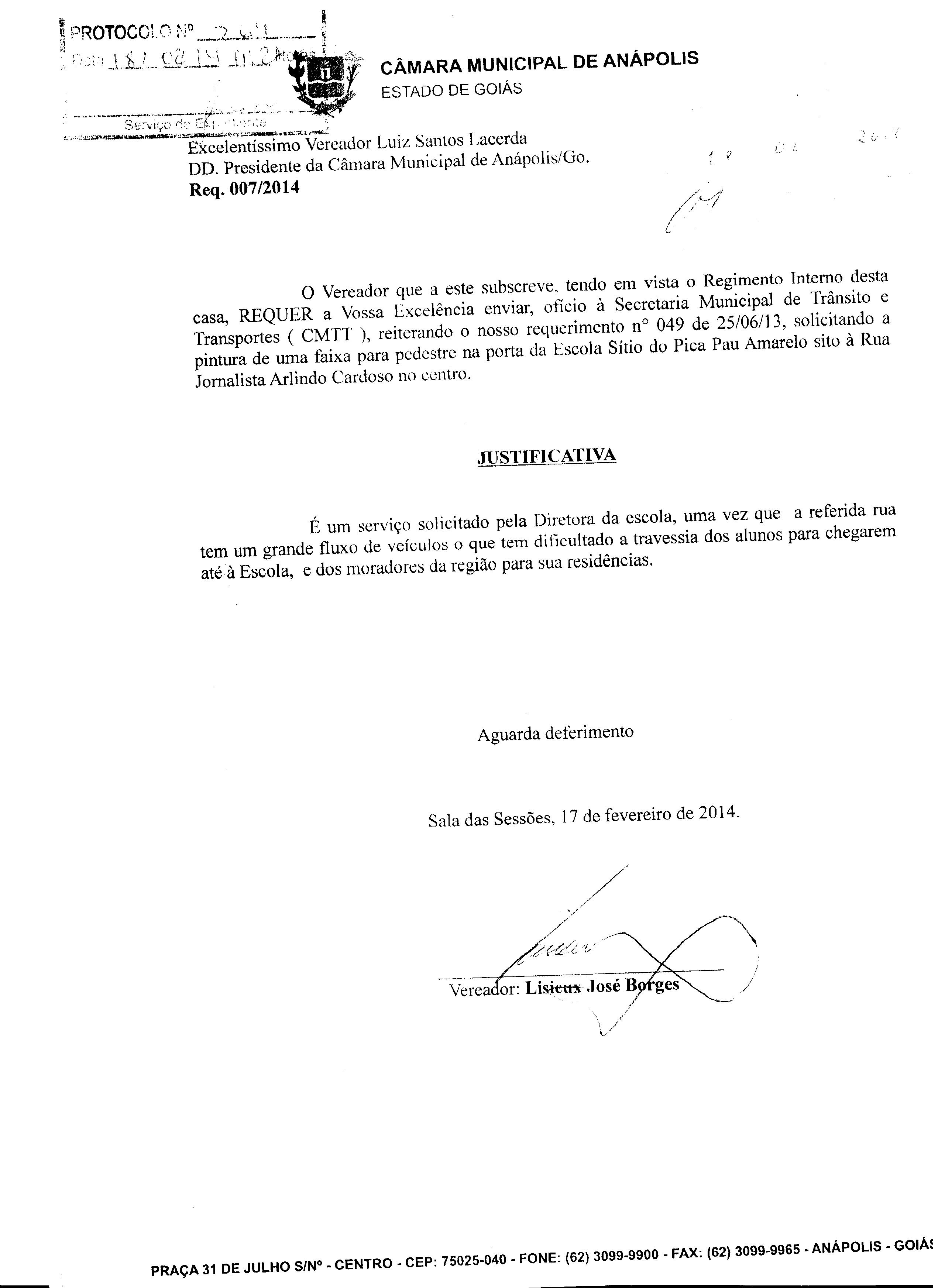 Ementa: Á SECRETARIA MUNICIPAL DE TRÂNSITO E TRANSPORTES (CMTT), REITERANDO O NOSSO REQUERIMENTO N° 049 DE 25/06/13, SOLICITANDO A PINTURA DE UMA FAIXA PARA PEDESTRE NA PORTA DA ESCOLA SÍTIO DO PICA PAU AMARELO À RUA JORNALISTA ARLINDO CARDOSO NO CENTRO.