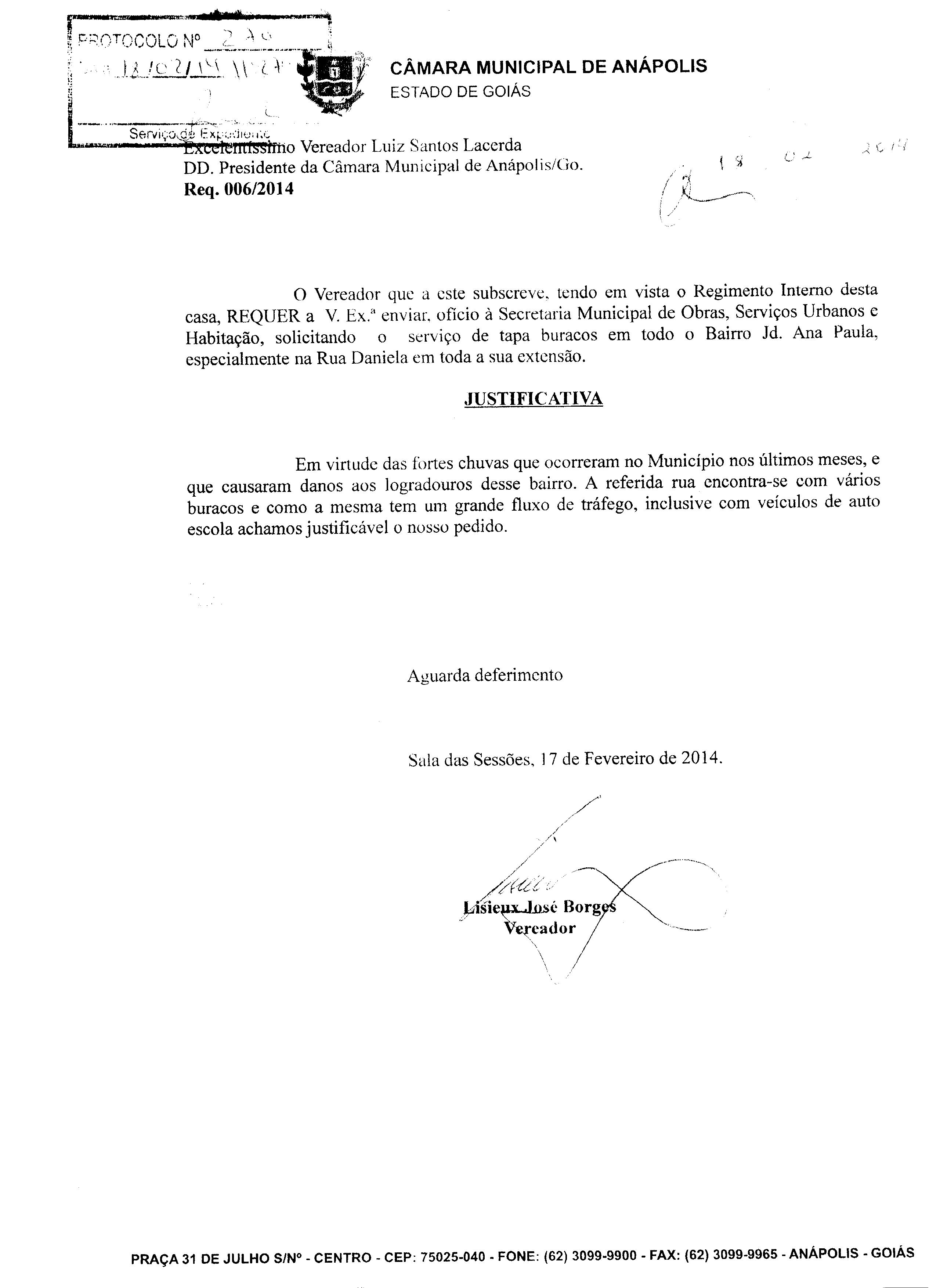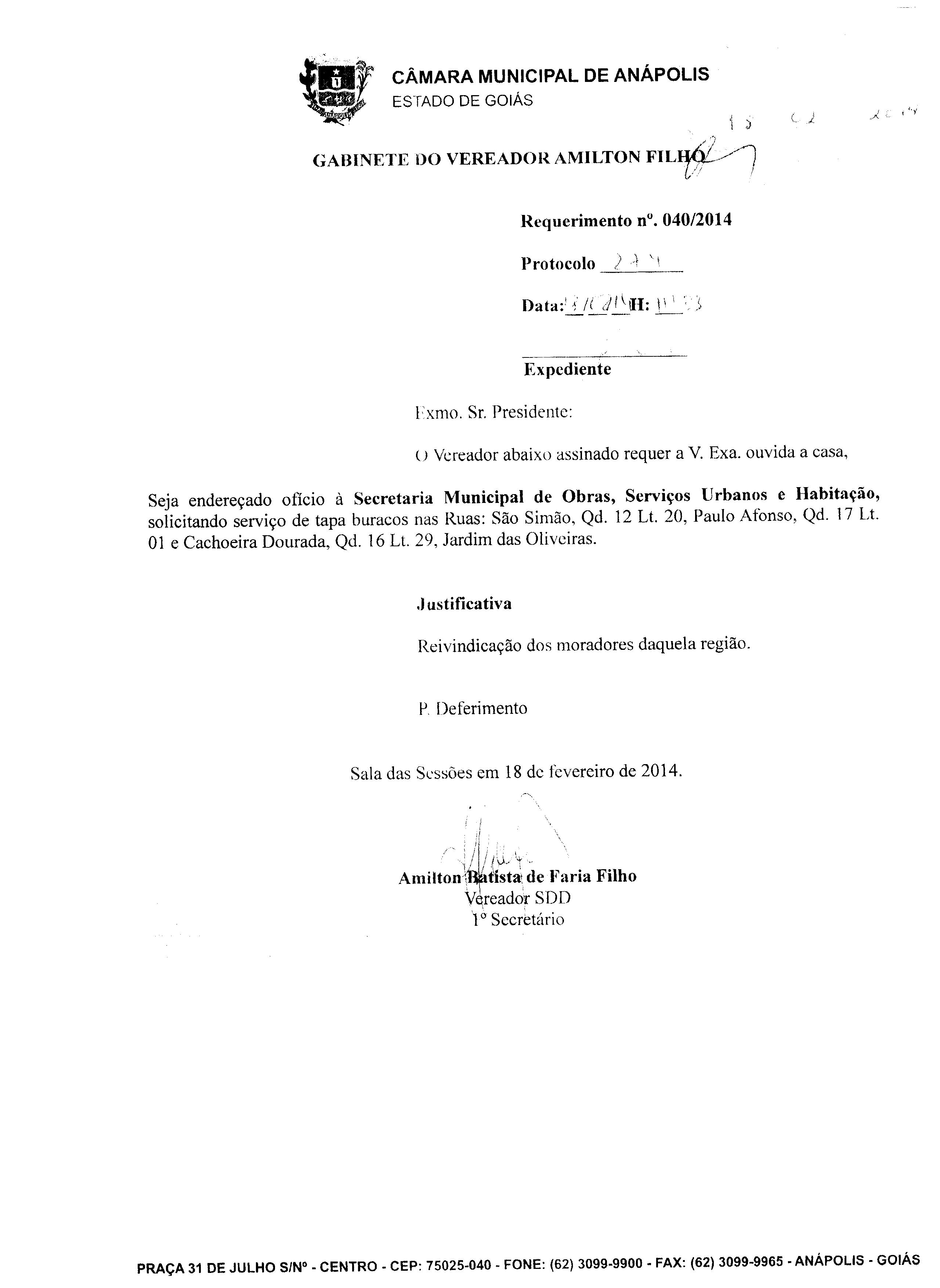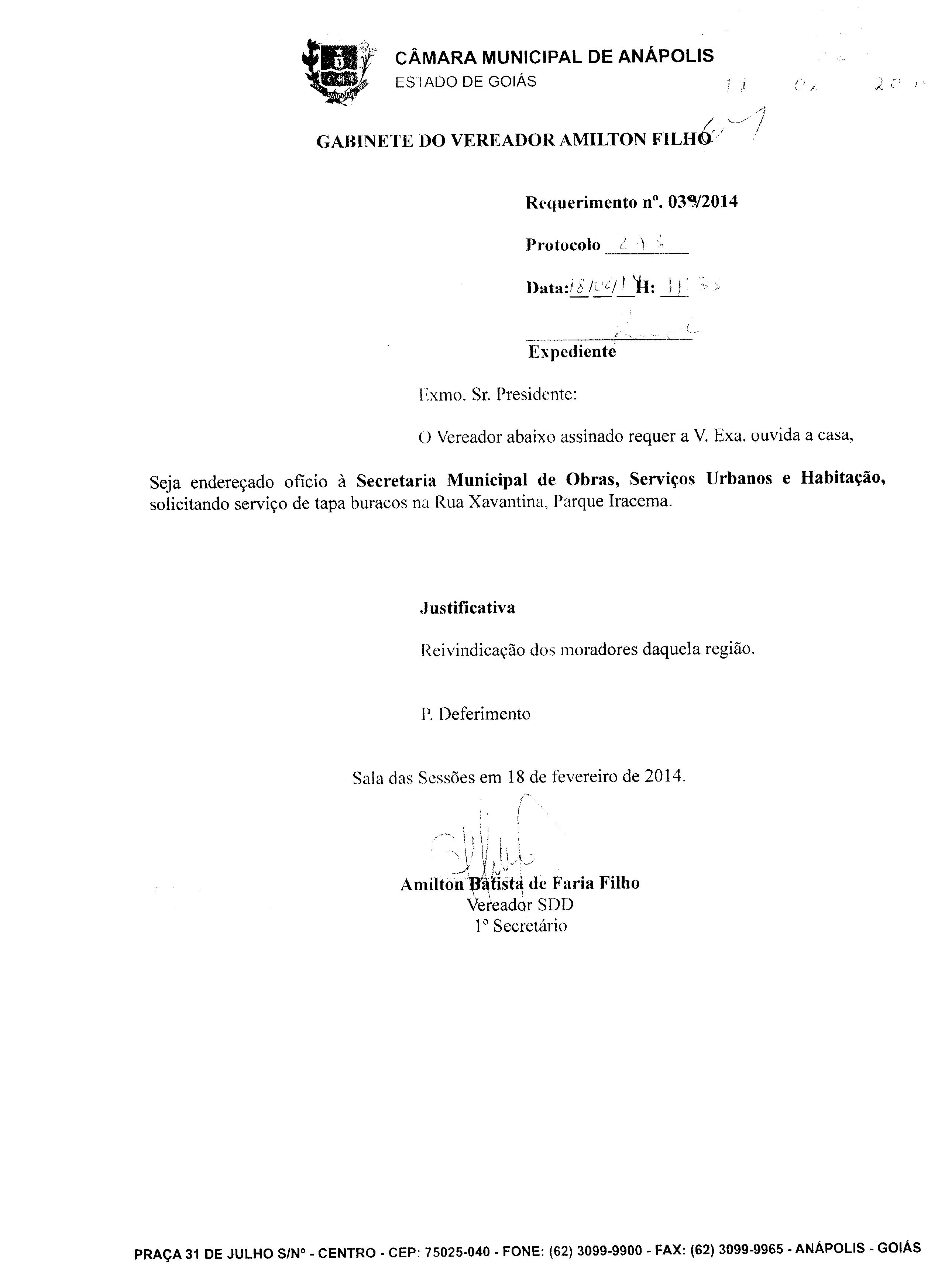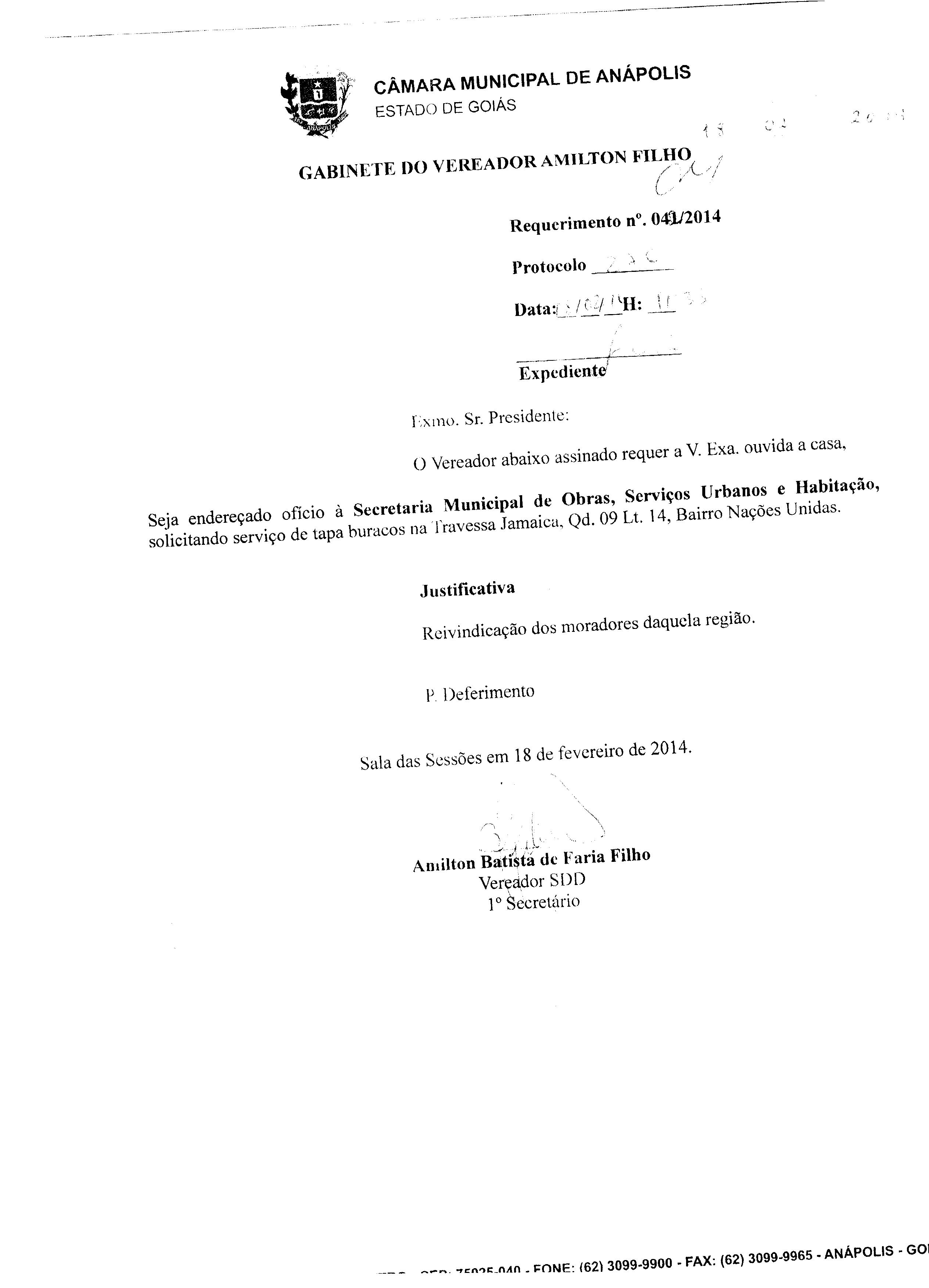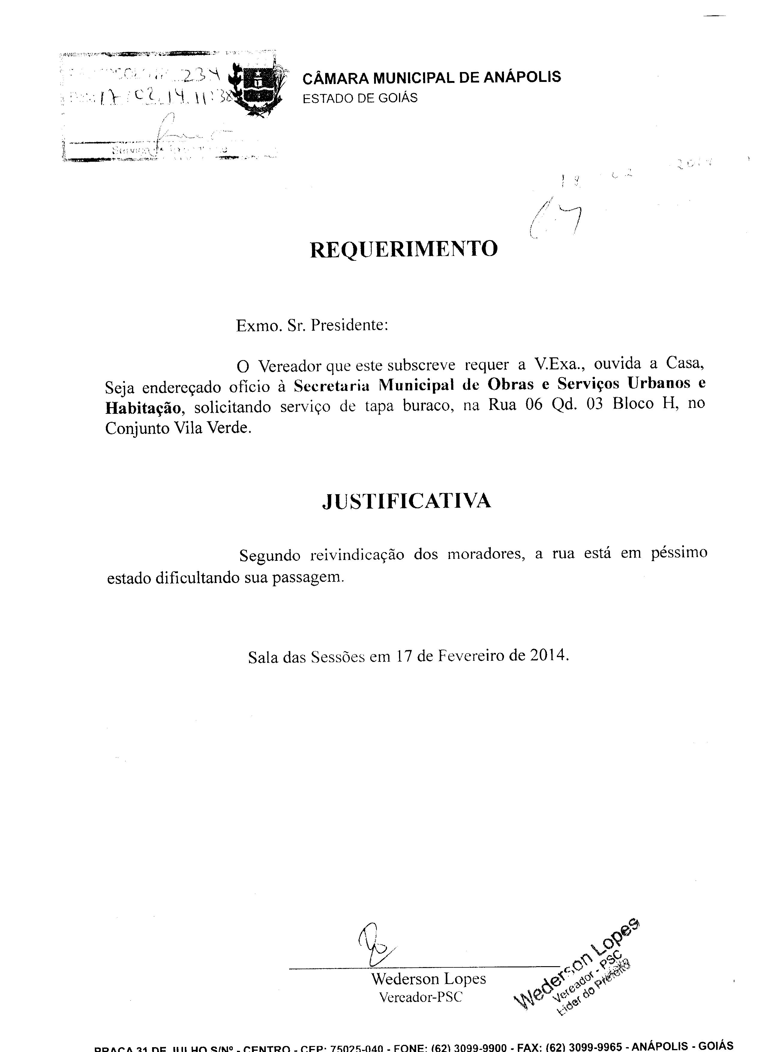 Ementa: À SECRETARIA MUNICIPAL DE OBRAS, SERVIÇOS URBANOS E HABITAÇÃO, SOLICITANDO SERVIÇO DE TAPA BURACOS, NO BAIRRO CALIXTÓPOLIS. PROTOCOLO Nº 1806/2014.