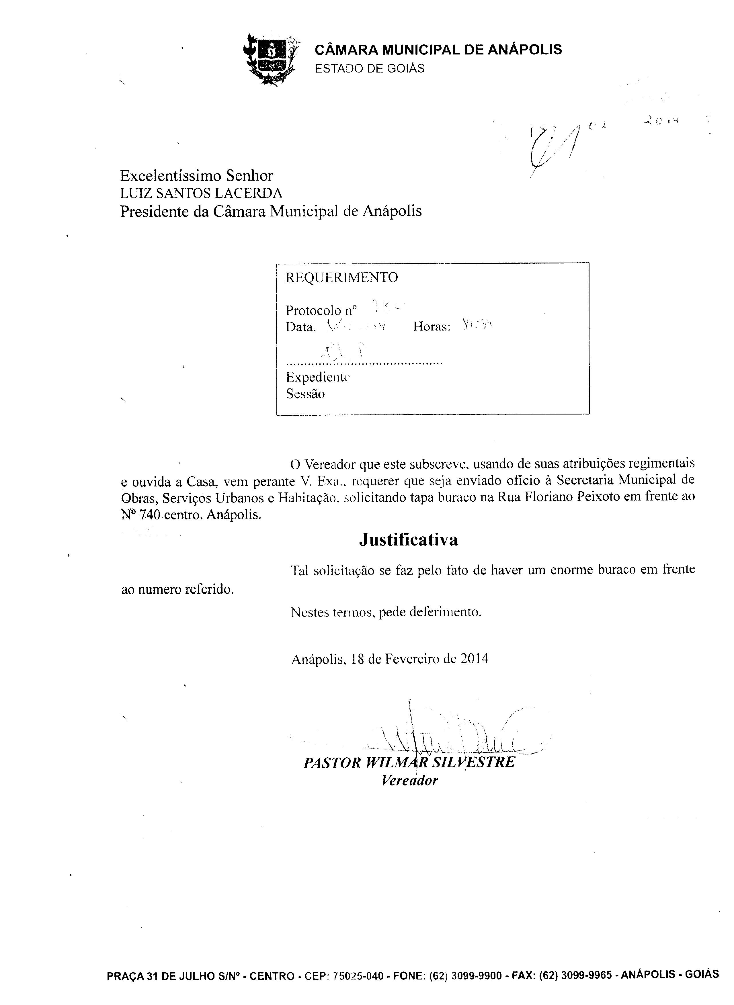 Ementa: À SECRETARIA MUNICIPAL DE OBRAS, SERVIÇOS URBANOS E HABITAÇÃO, SOLICITANDO TAPA BURACO NA RUA FLORIANO PEIXOTO EM FRENTE AO Nº 740, CENTRO, ANÁPOLIS.