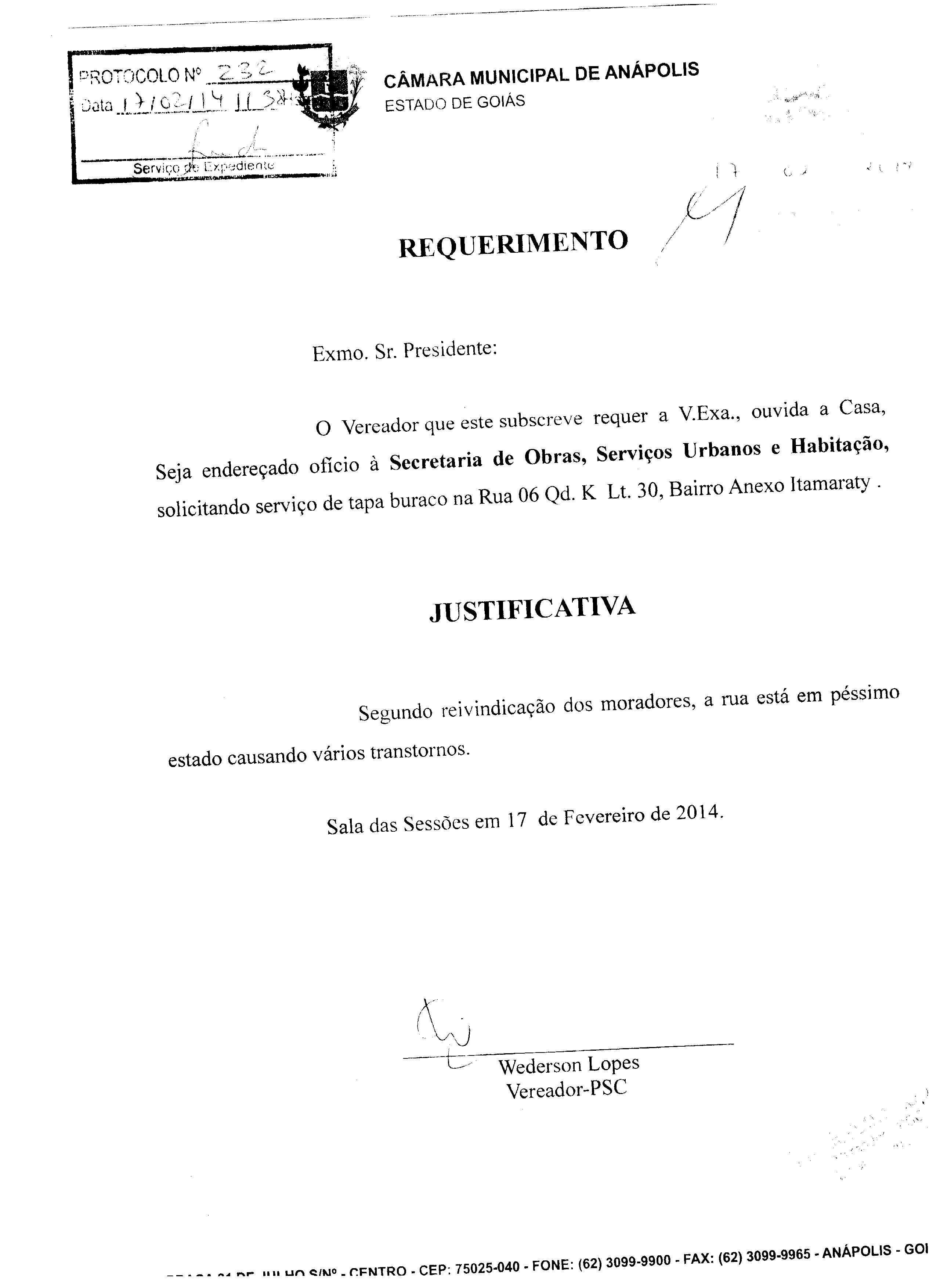Ementa: Á SECRETARIA DE OBRAS, SERVIÇOS URBANOS E HABITAÇÃO,SOLICITANDO SERVIÇO DE TAPA BURACO NA RUA 06 QD.K LT.30, BAIRRO ANEXO ITAMARATY.