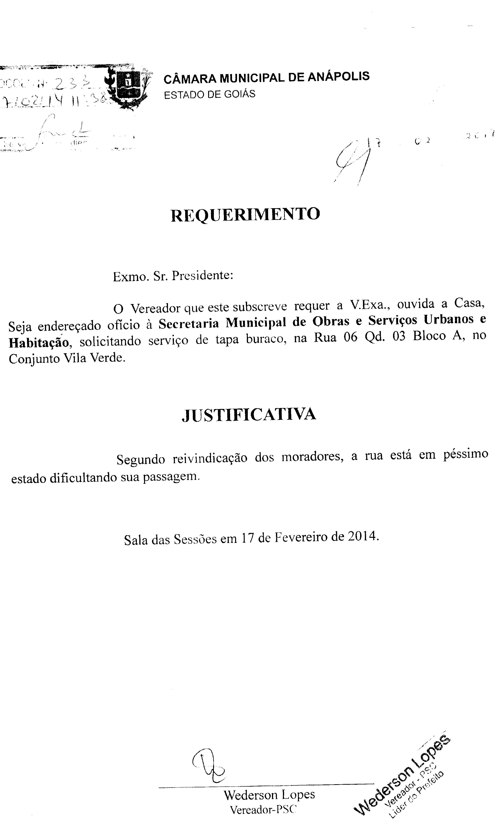 Ementa: Á SECRETARIA MUNICIPAL DE OBRAS E SERVIÇOS URBANOS E HABITAÇÃO, SOLICITANDO SERVIÇO DE TAPA BURACO, NA RUA 06 QD. 03 BLOCO H, NO CONJINTO VILA VERDE.