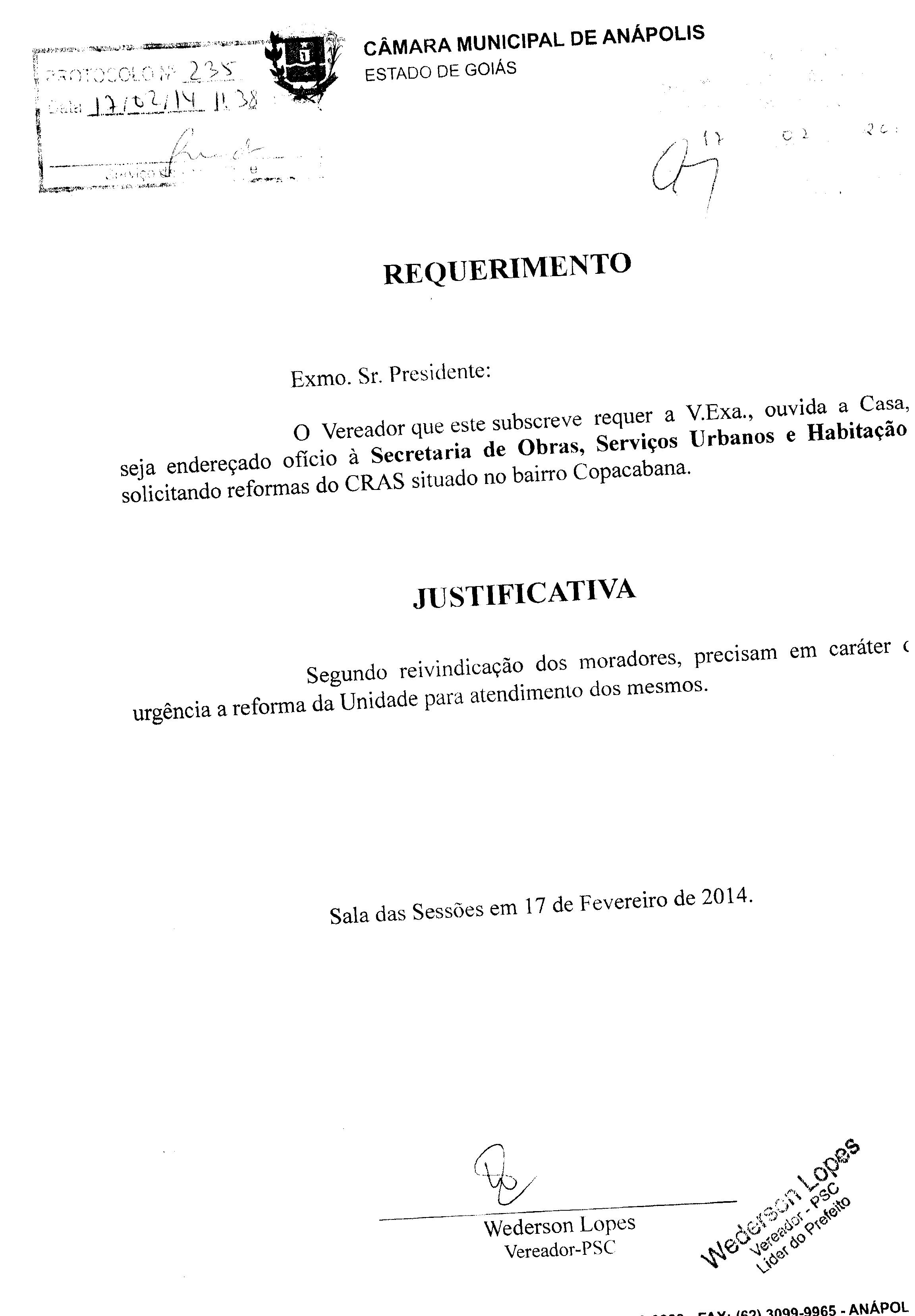 Ementa: Á SECRETARIA DE OBRAS, SERVIÇOS URBANOS E HABITAÇÃO, SOLICITANDO REFORMAS DO CRAS SITUADO NO BAIRRO COPACABANA.