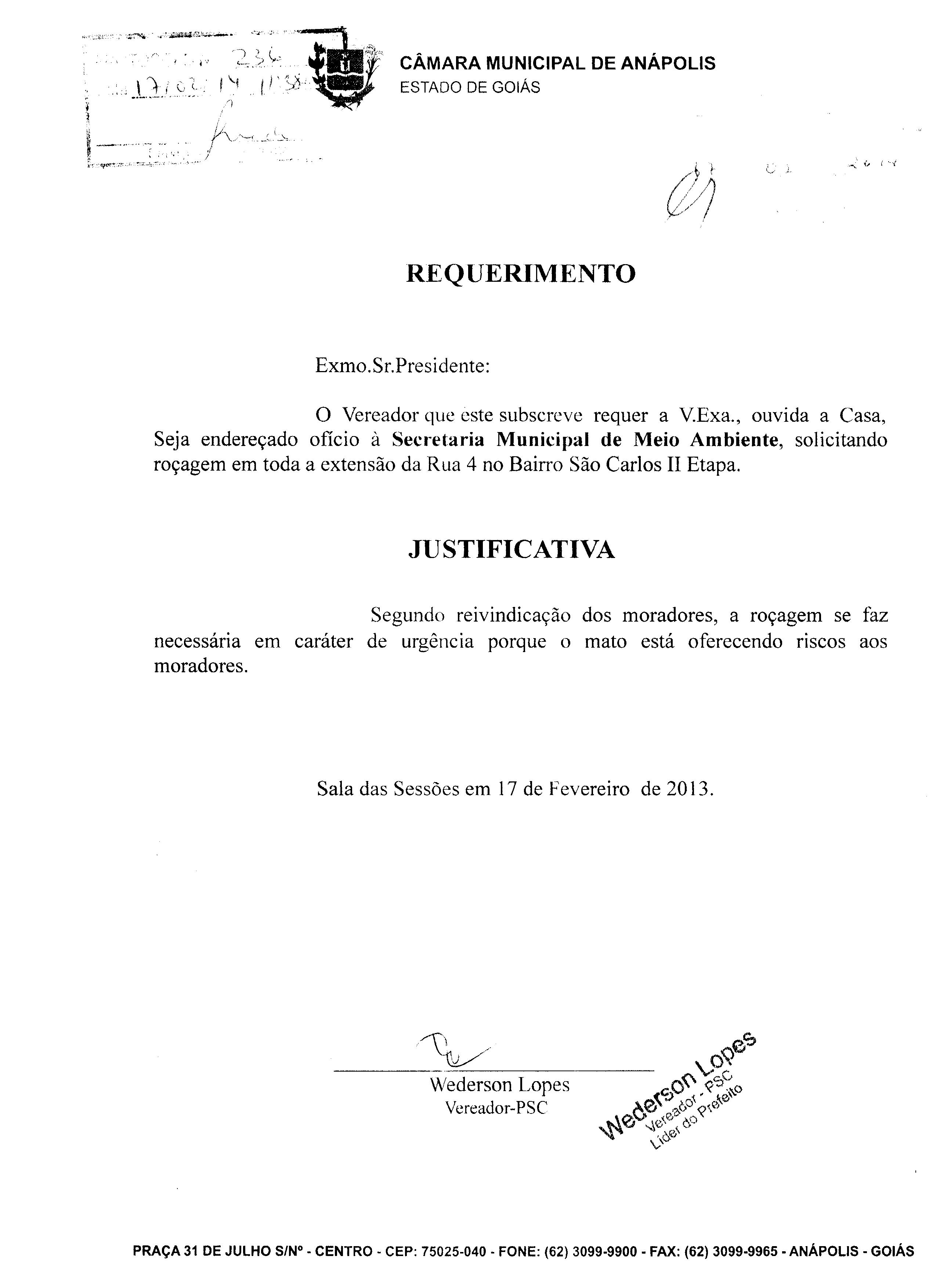 Ementa: Á SECRETARIA MUNICIPAL DE MEIO AMBIENTE, SOLICITANDO ROÇAGEM EM TODA A EXTENSÃO DA RUA 4 NO BAIRRO SÃO CARLOS II ETAPA.