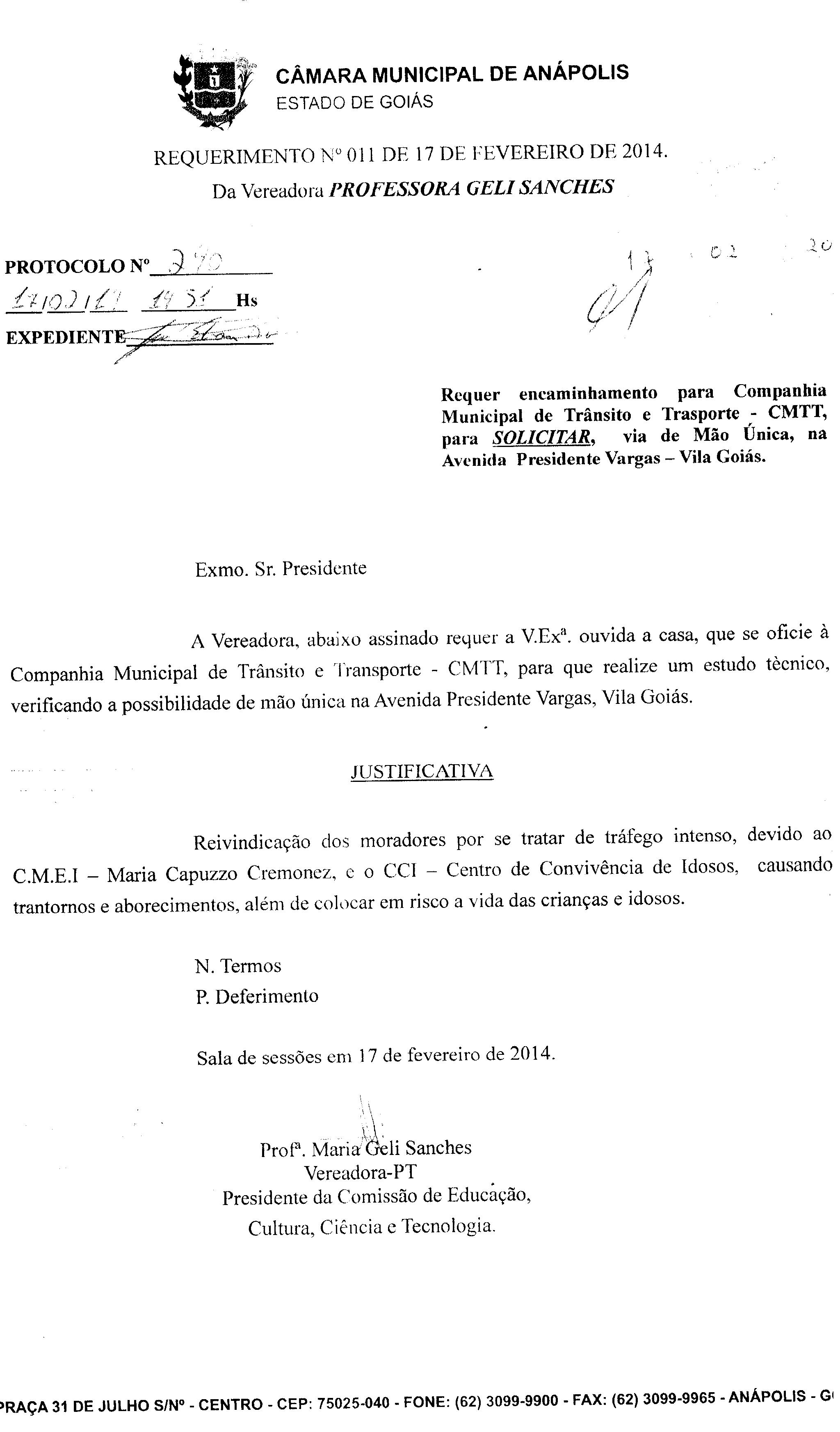 Ementa: Á COMPANHIA MUNICIPAL DE TRÂNSITO E TRANSPORTE-CMTT, PARA QUE REALIZE UM ESTUDO TÉCNICO, VERIFICANDO A POSSIBILIDADE DE MÃO ÚNICA NA AVENIDA PRESIDENTE VARGAS, VILA GOIÁS.