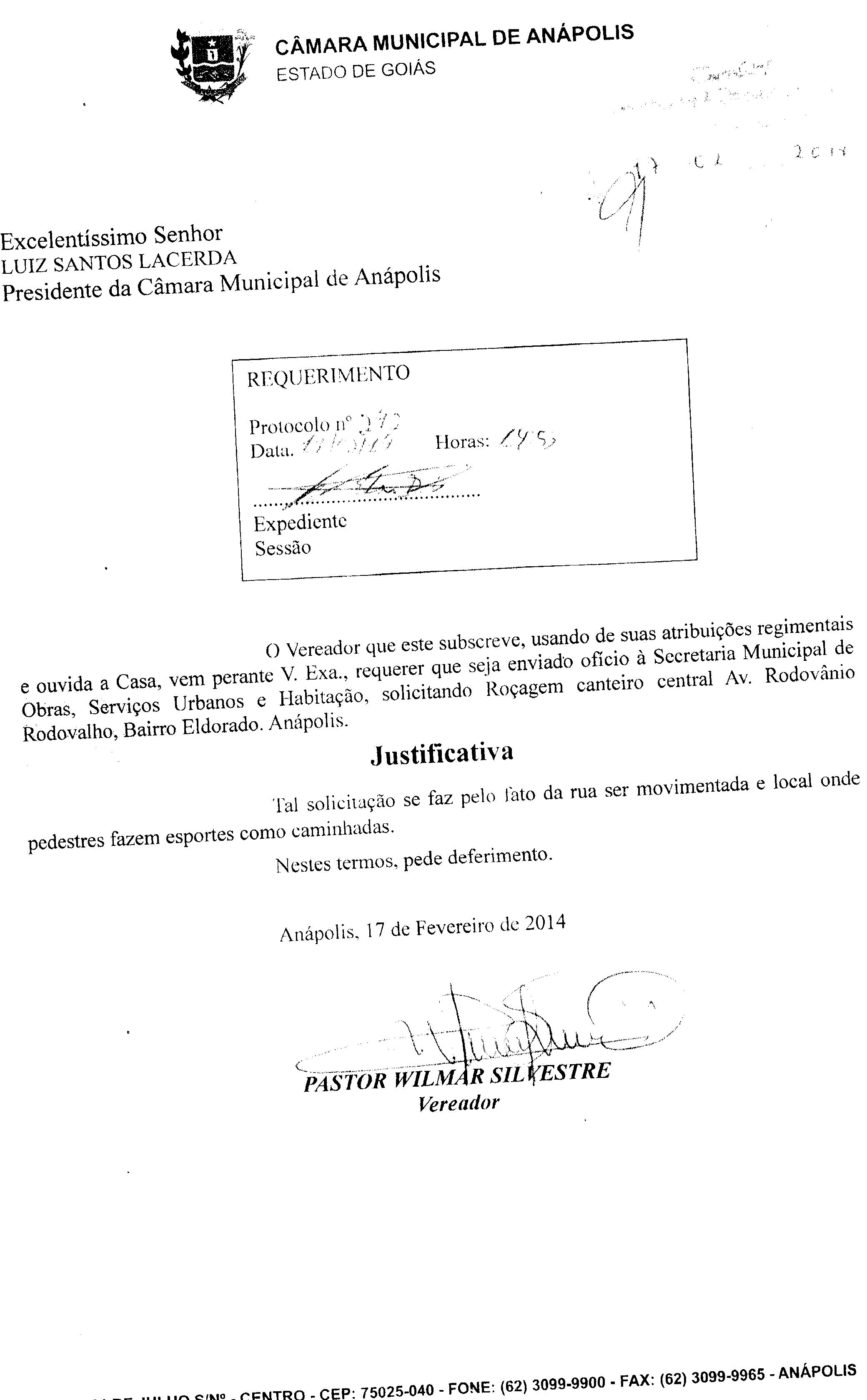 Ementa: À SECRETARIA MUNICIPAL DE OBRAS, SERVIÇOS URBANOS E HABITAÇÃO, SOLICITANDO ROÇAGEM DO CANTEIRO CENTRAL, AV. RODOVÂNIO RODOVALHO, BAIRRO ELDORADO. ANÁPOLIS.