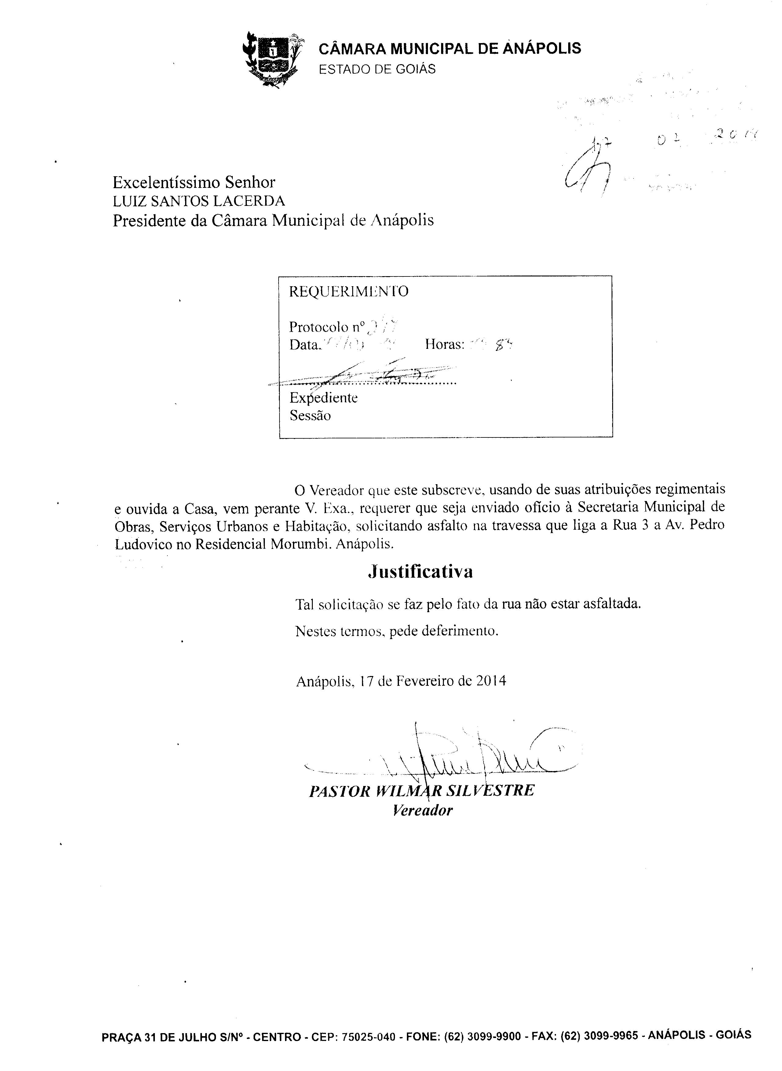 Ementa: À SECRETARIA MUNICIPAL DE OBRAS, SEVIÇOS URBANOS E HABITAÇÃO, SOLICITANDO ASFALTO NA TRAVESSA QUE LIGA A RUA 3 A AV. PEDRO LUDOVICO NO RESIDENCIAL MORUMBI. ANÁPOLIS.