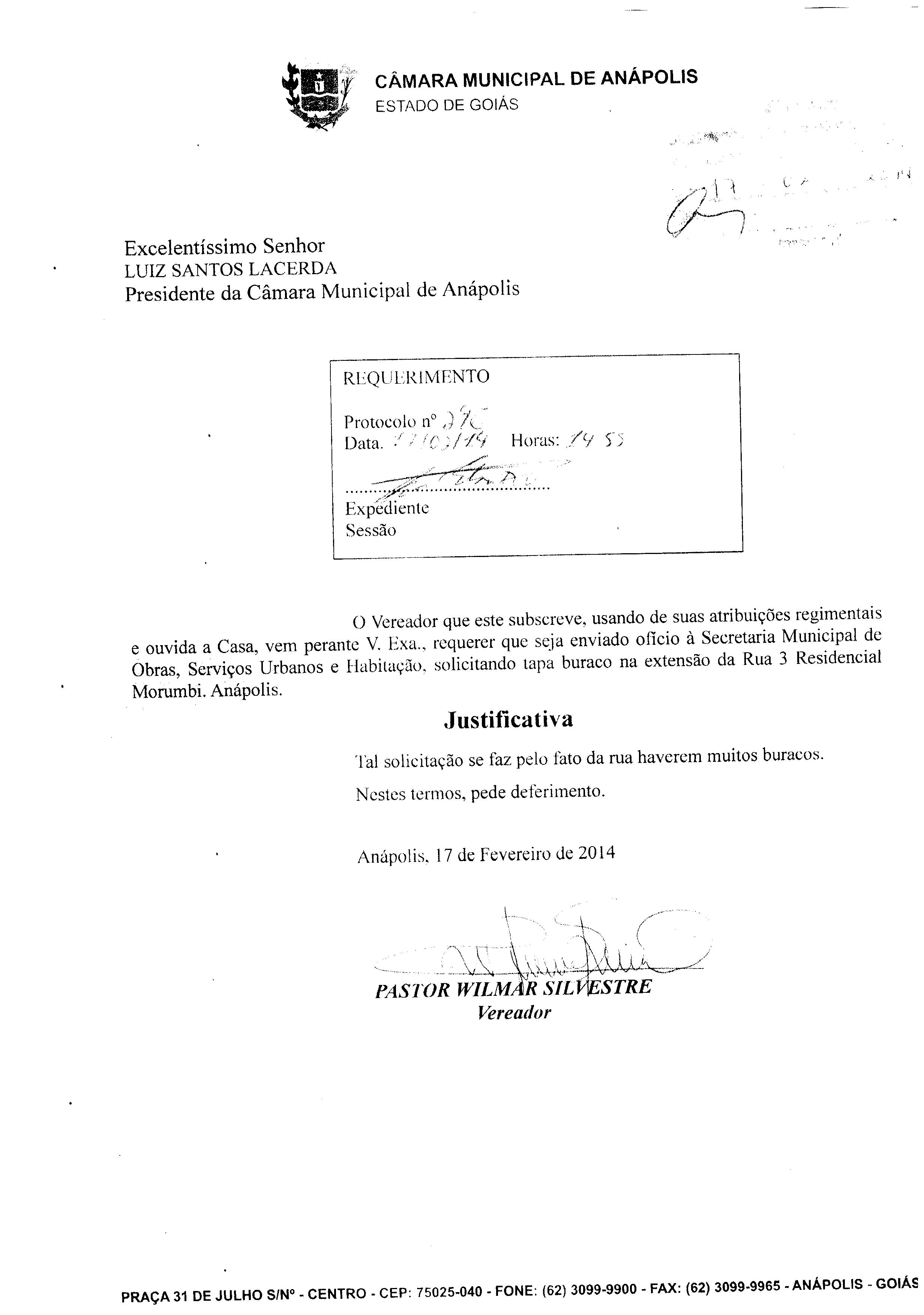 Ementa: À SECRETARIA MUNICIPAL DE OBRAS, SERVIÇOS URBANOS E HABITAÇÃO, SOLICITANDO TAPA BURACO NA EXTENSÃO DA RUA 03, RESIDENCIAL MORUMBI. ANÁPOLIS.