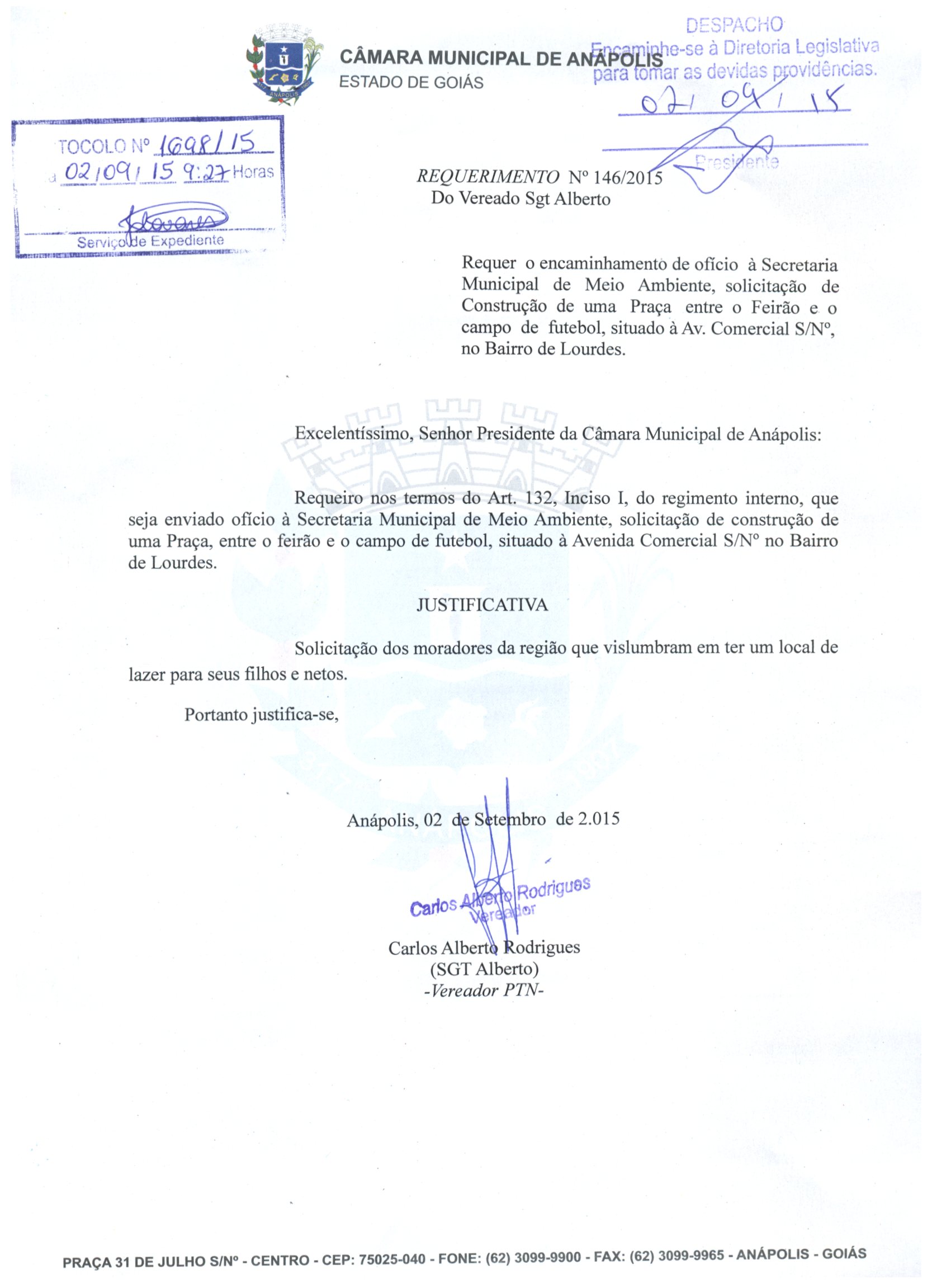 Ementa: À SECRETARIA MUNICIPAL DE MEIO AMBIENTE, SOLICITAÇÃO DE CONSTRUÇÃO DE UMA PRAÇA ENTRE O FEIRÃO E O CAMPO DE FUTEBOL, SITUADO À AVENIDA COMERCIAL S/Nº NO BAIRRO DE LOURDES.