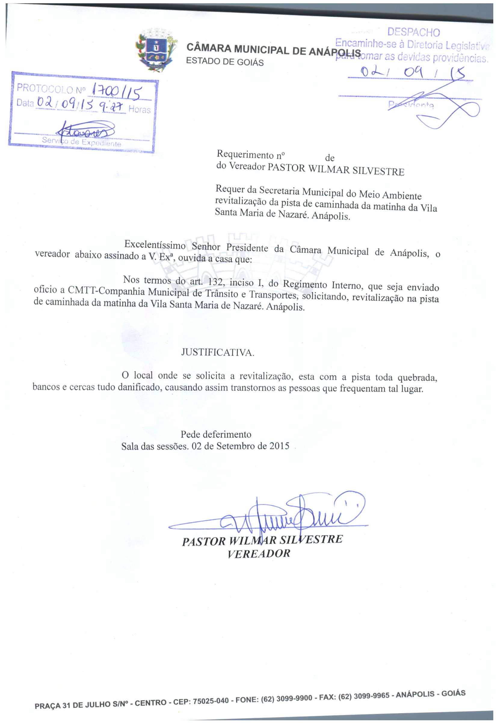 Ementa: QUE SEJA ENVIADO OFÍCIO À CMTT - COMPANHIA MUNICIPAL DE TRÂNSITO E TRANSPORTE, SOLICITANDO REVITALIZAÇÃO NA PISTA DE CAMINHADA DA MATINHA DA VILA SANTA MARIA DE NAZARÉ, ANÁPOLIS.