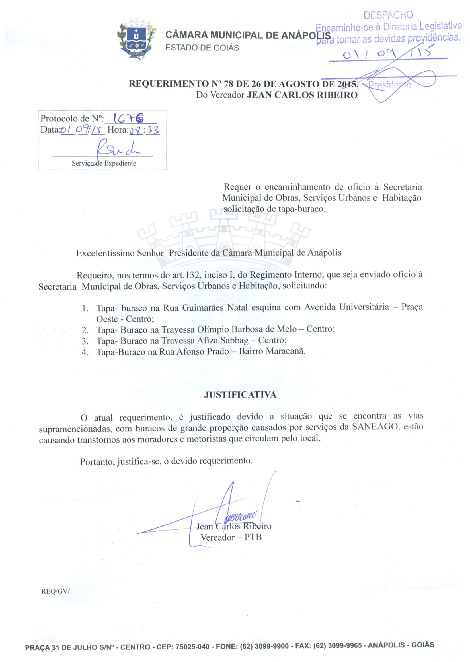Ementa: À SECRETARIA MUNICIPAL DE OBRAS, SERVIÇOS URBANOS E HABITAÇÃO, SOLICITANDO: 1 - TAPA BURACO NA RUA GUIMARÃES NATAL ESQUINA COM A AVENIDA UNIVERSITÁRIA - PRAÇA OESTE - CENTRO; 2 - TAPA BURACO NA TRAVESSA OLÍMPIO BARBOSA DE MELO - CENTRO; 3 - TAPA BURACO NA TRAVESSA AFIZA SABBAG - CENTRO; 4 - TAPA BURACO NA RUA AFONSO PRADO - BAIRRO MARACANÃ.