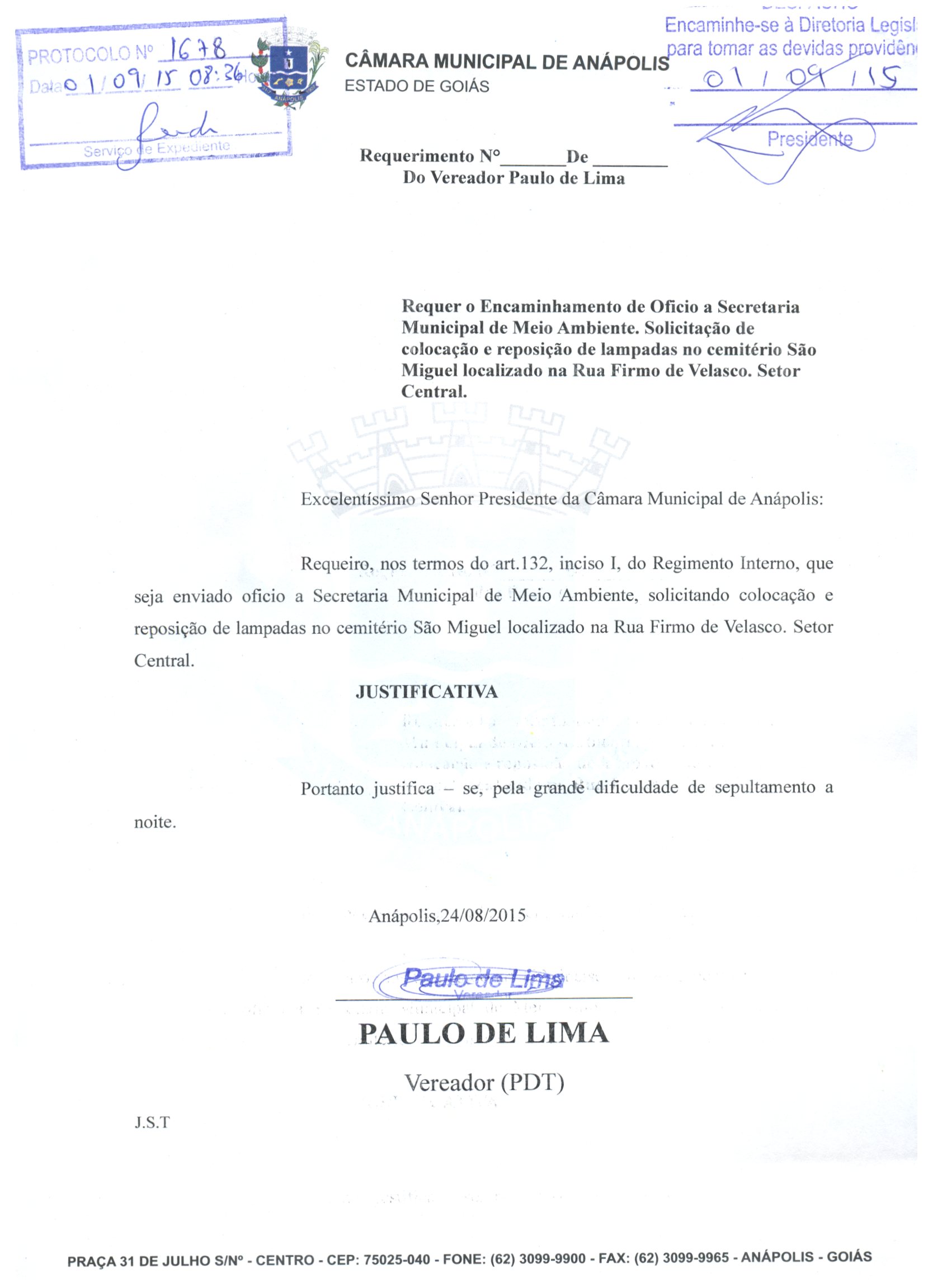 Ementa: À SECRETARIA MUNICIPAL DE MEIO AMBIENTE, SOLICITANDO COLOCAÇÃO E REPOSIÇÃO DE LÂMPADAS NO CEMITÉRIO SÃO MIGUEL LOCALIZADO NA RUA FIRMO DE VELASCO. SETOR CENTRAL.