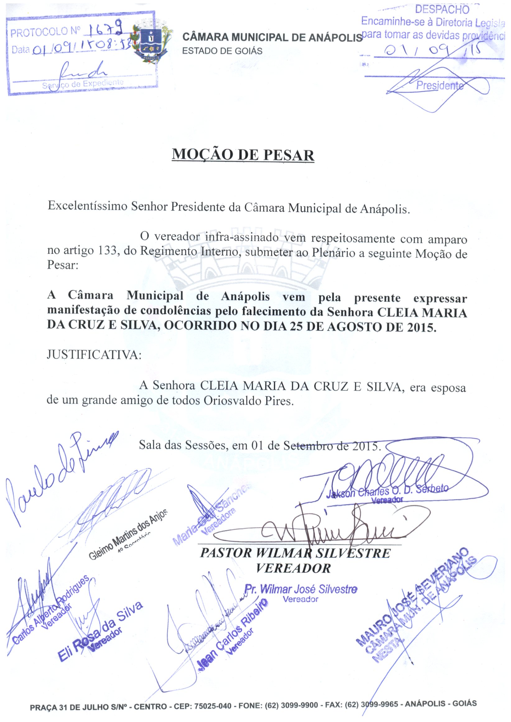 Ementa: A CÂMARA MUNICIPAL DE ANÁPOLIS VEM PELA PRESENTE, EXPRESSAR MANIFESTAÇÃO DE CONDOLÊNCIAS PELO FALECIMENTO DA SENHORA CLEIA MARIA DA CRUZ E SILVA, OCORRIDO NO DIA 25 DE AGOSTO DE 2015.