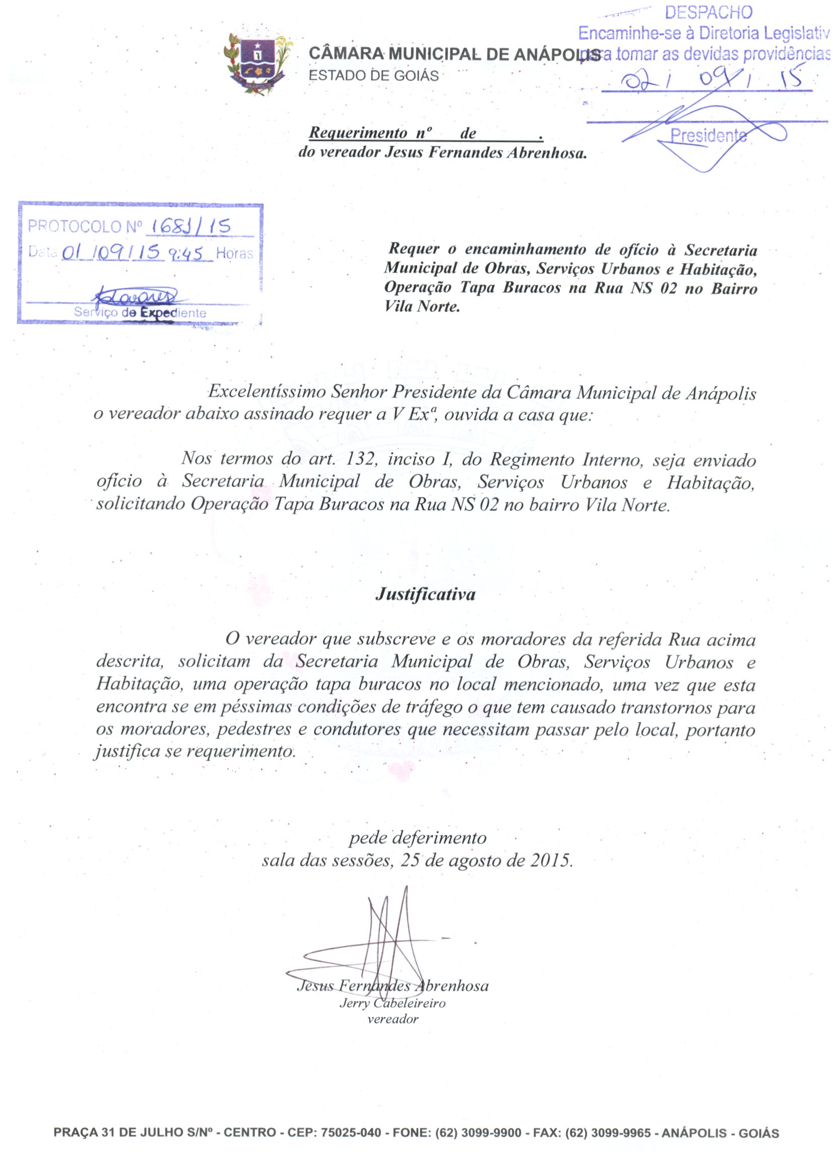 Ementa: À SECRETARIA MUNICIPAL DE OBRAS, SERVIÇOS URBANOS E HABITAÇÃO, SOLICITANDO OPERAÇÃO TAPA BURACOS NA RUA NS 02, NO BAIRRO VILA NORTE.