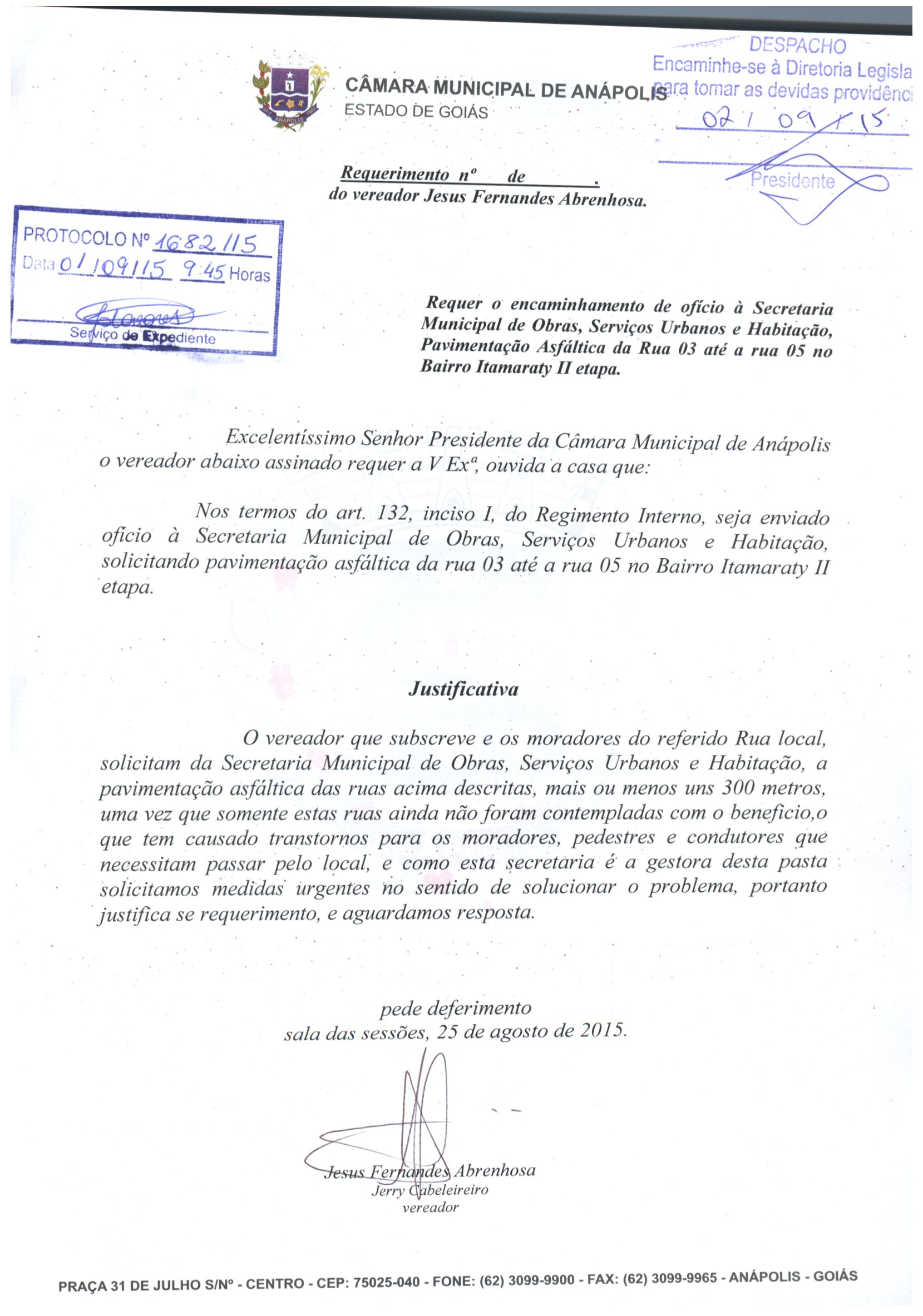 Ementa: À SECRETARIA MUNICIPAL DE OBRAS, SERVIÇOS URBANOS E HABITAÇÃO, SOLICITANDO PAVIMENTAÇÃO ASFÁLTICA DA RUA 03, ATÉ A RUA 05, NO BAIRRO ITAMARATY II ETAPA.