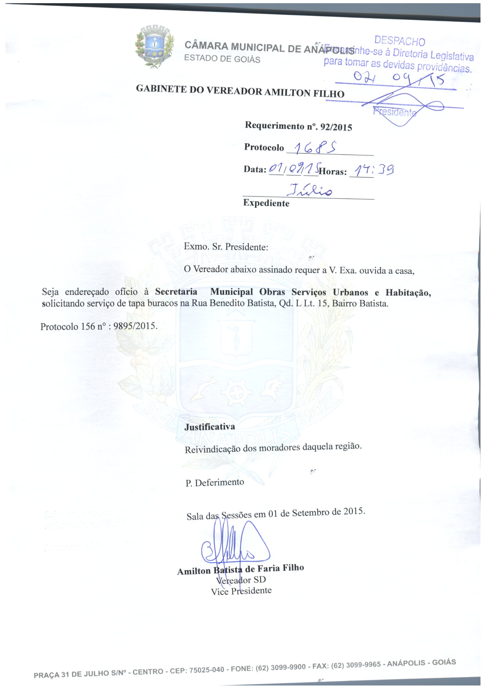 Ementa: À SECRETARIA MUNICIPAL DE OBRAS, SERVIÇOS URBANOS E HABITAÇÃO, SOLICITANDO OPERAÇÃO TAPA BURACOS NA RUA BENEDITO BATISTA, QUADRA L, LOTE 15, BAIRRO BATISTA.