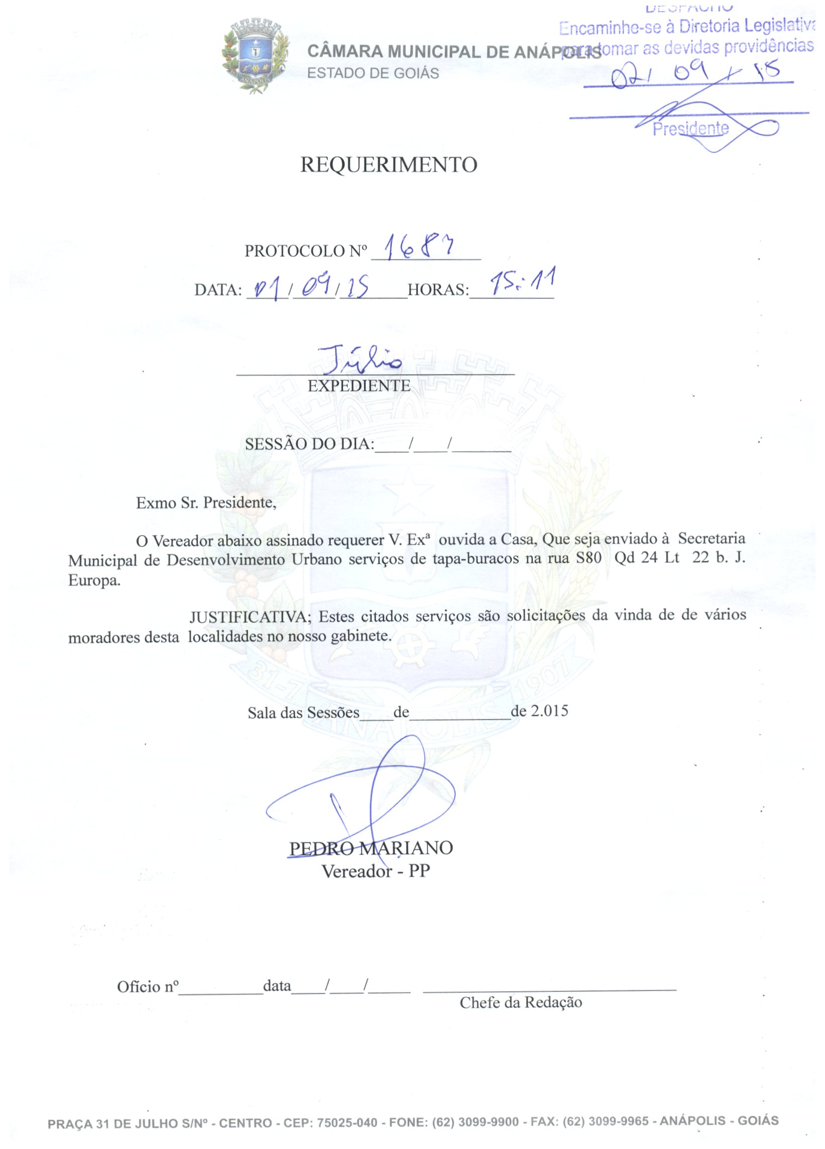 Ementa: À SECRETARIA MUNICIPAL DE DESENVOLVIMENTO URBANO, SERVIÇOS DE TAPA BURACOS NA RUA S80, QUADRA 24, LOTE 22 B. JARDIM EUROPA.