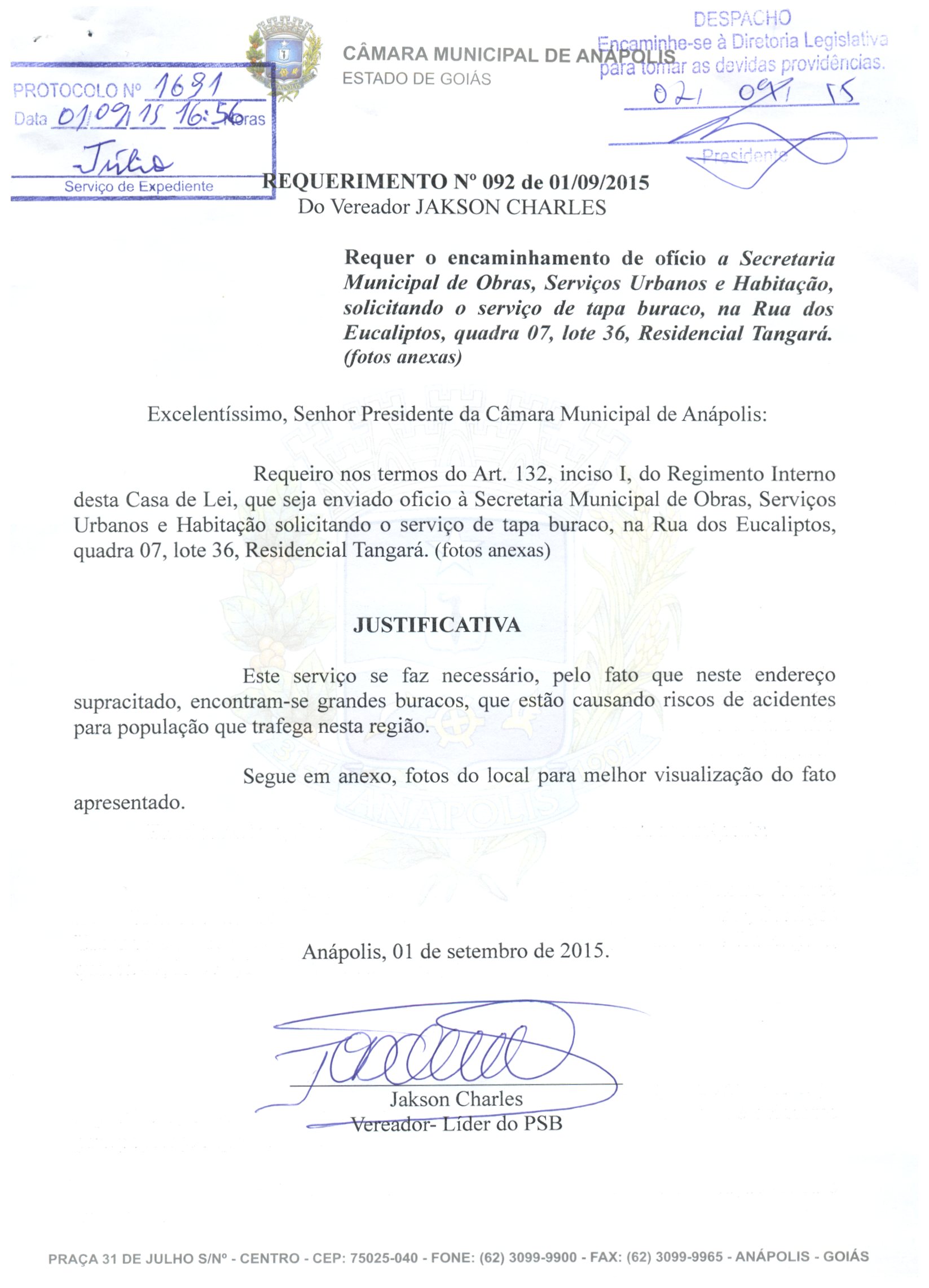 Ementa: À SECRETARIA MUNICIPAL DE OBRAS, SERVIÇOS URBANOS E HABITAÇÃO, SOLICITANDO O SERVIÇO DE TAPA BURACO, NA RUA DOS EUCALIPTOS, QUADRA 07, LOTE 36, RESIDENCIAL TANGARÁ.