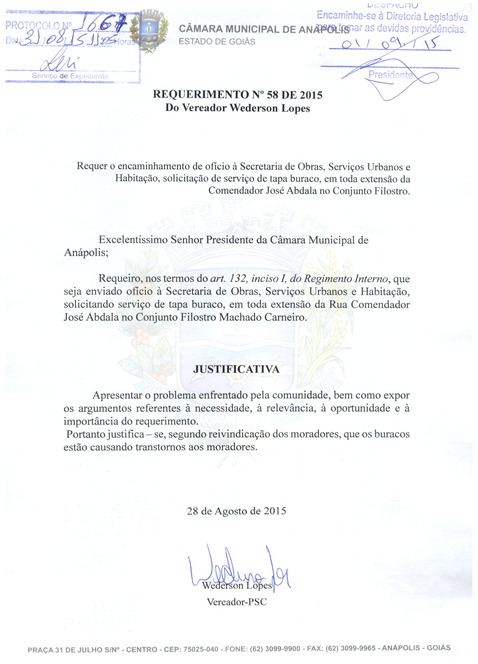 Ementa: À SECRETARIA MUNICIPAL DE OBRAS, SERVIÇOS URBANOS E HABITAÇÃO, SOLICITANDO SERVIÇO DE TAPA BURACO, EM TODA EXTENSÃO DA RUA COMENDADOR JOSÉ ABDALA NO CONJUNTO FILOSTRO MACHADO CARNEIRO.