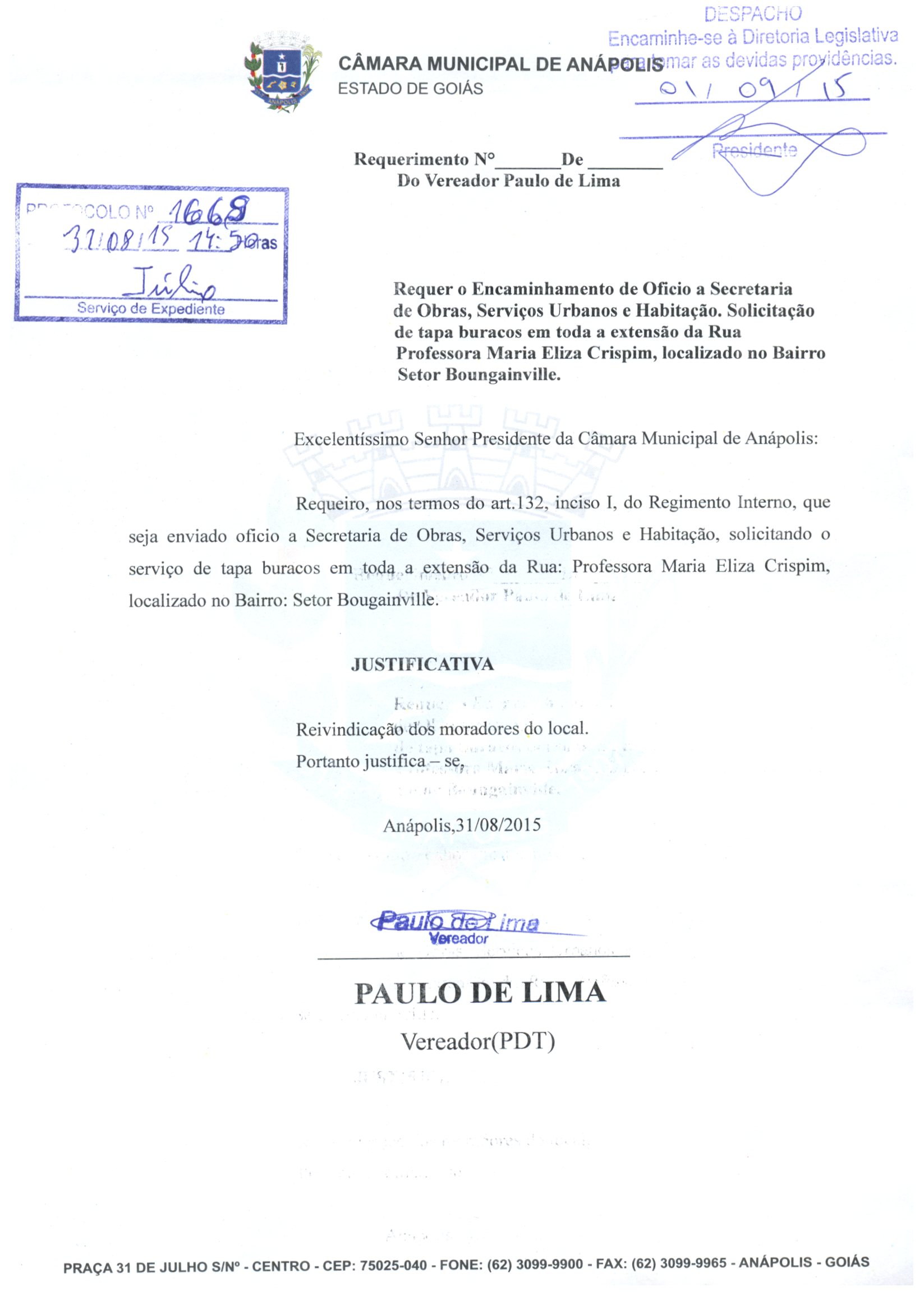 Ementa: À SECRETARIA MUNICIPAL DE OBRAS, SERVIÇOS URBANOS E HABITAÇÃO, SOLICITANDO SERVIÇO DE TAPA BURACO, EM TODA EXTENSÃO DA RUA PROFESSORA MARIA ELIZA CRISPIM, LOCALIZADO NO BAIRRO SETOR BOUGAINVILLE.