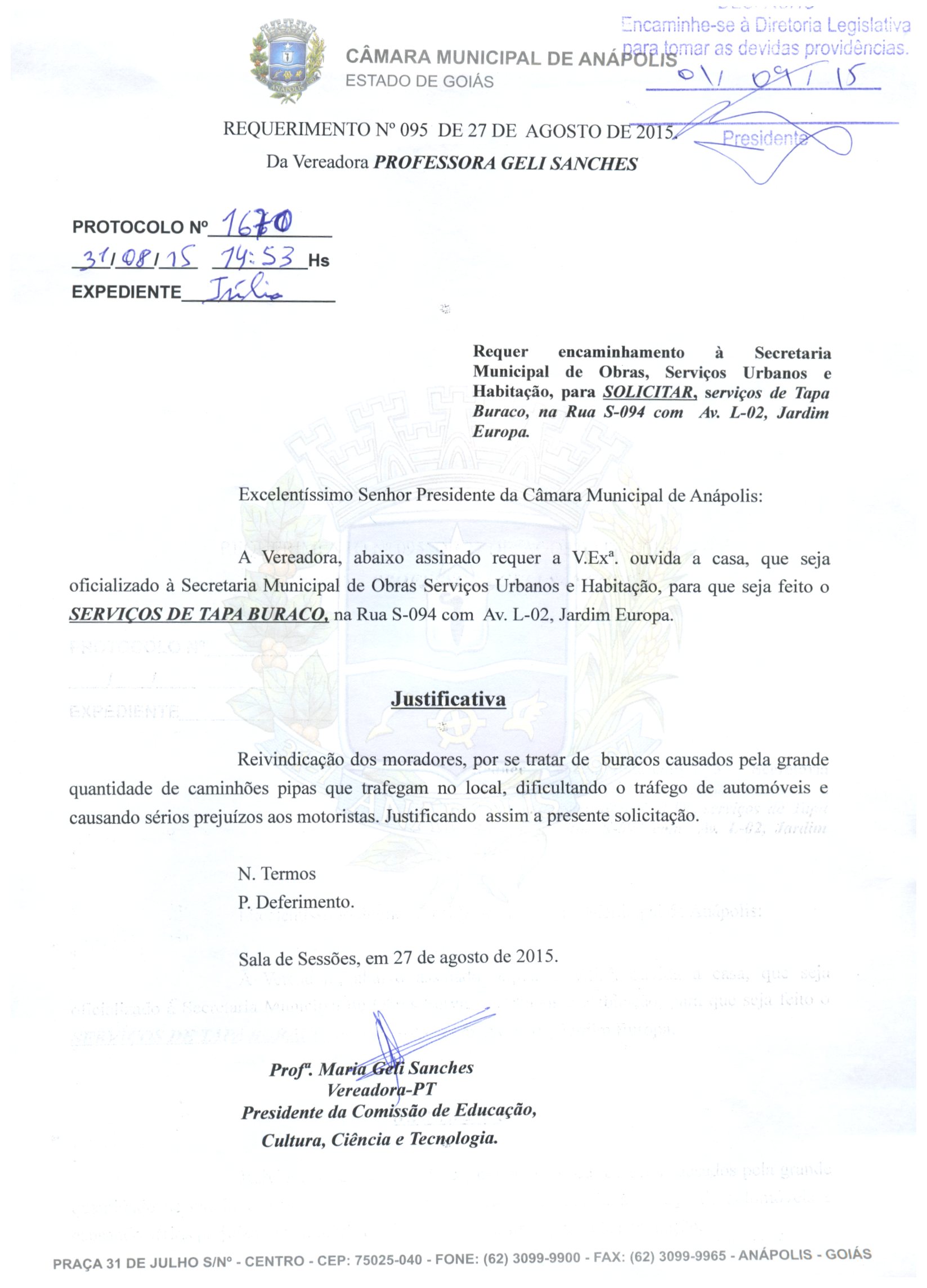 Ementa: À SECRETARIA MUNICIPAL DE OBRAS, SERVIÇOS URBANOS E HABITAÇÃO, PARA QUE SEJA FEITO O SERVIÇO DE TAPA BURACO, NA RUA S-094 COM AVENIDA L-02, JARDIM EUROPA.