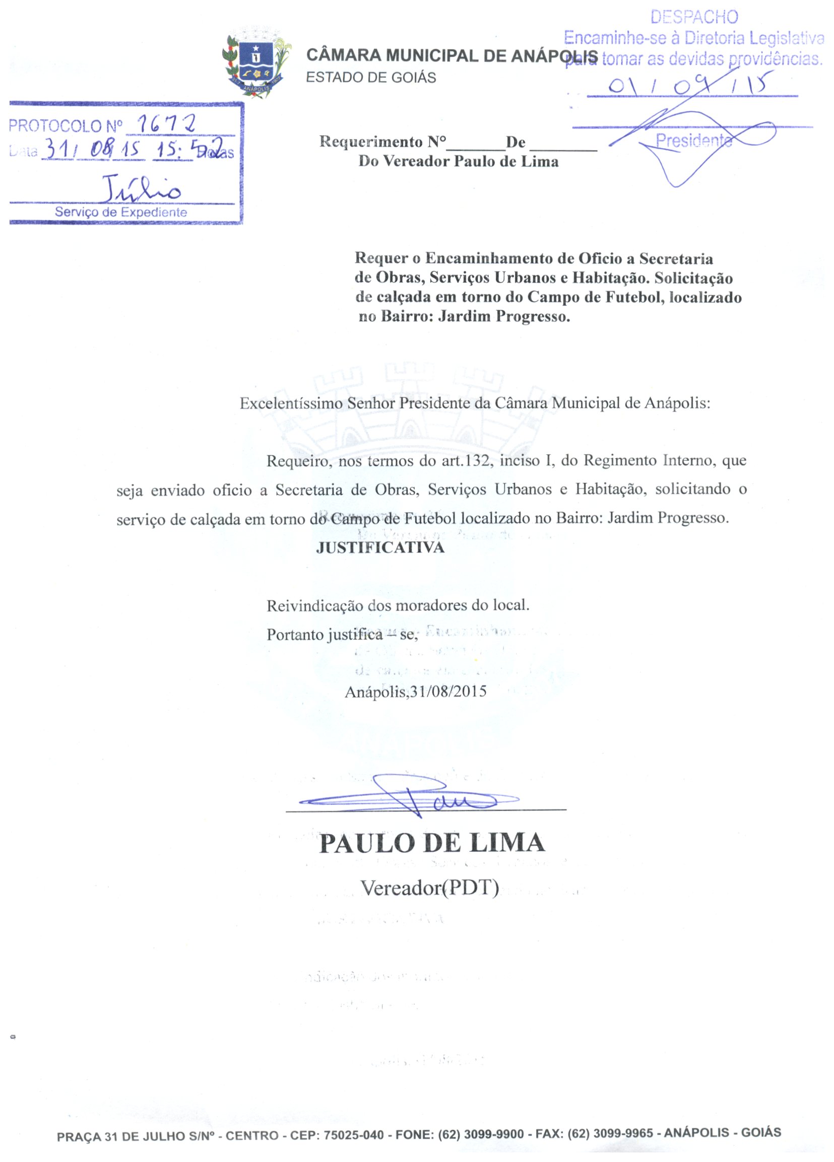 Ementa: À SECRETARIA MUNICIPAL DE OBRAS, SERVIÇOS URBANOS E HABITAÇÃO, SOLICITANDO O SERVIÇO DE CALÇADA EM TORNO DO CAMPO DE FUTEBOL LOCALIZADO NO BAIRRO JARDIM PROGRESSO.