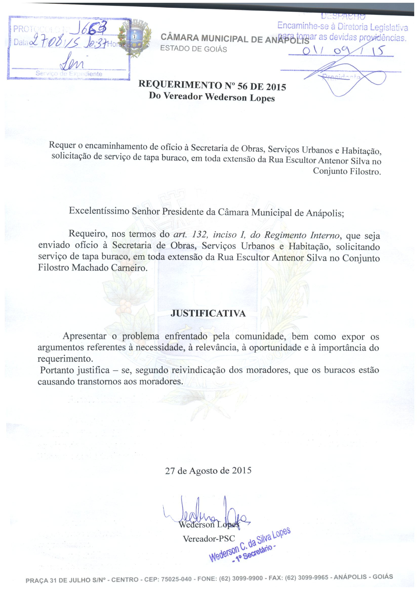 Ementa: À SECRETARIA MUNICIPAL DE OBRAS, SERVIÇOS URBANOS E HABITAÇÃO, SOLICITANDO SERVIÇO DE TAPA BURACO, EM TODA EXTENSÃO DA RUA ESCULTOR ANTENOR SILVA NO CONJUNTO FILOSTRO MACHADO CARNEIRO.