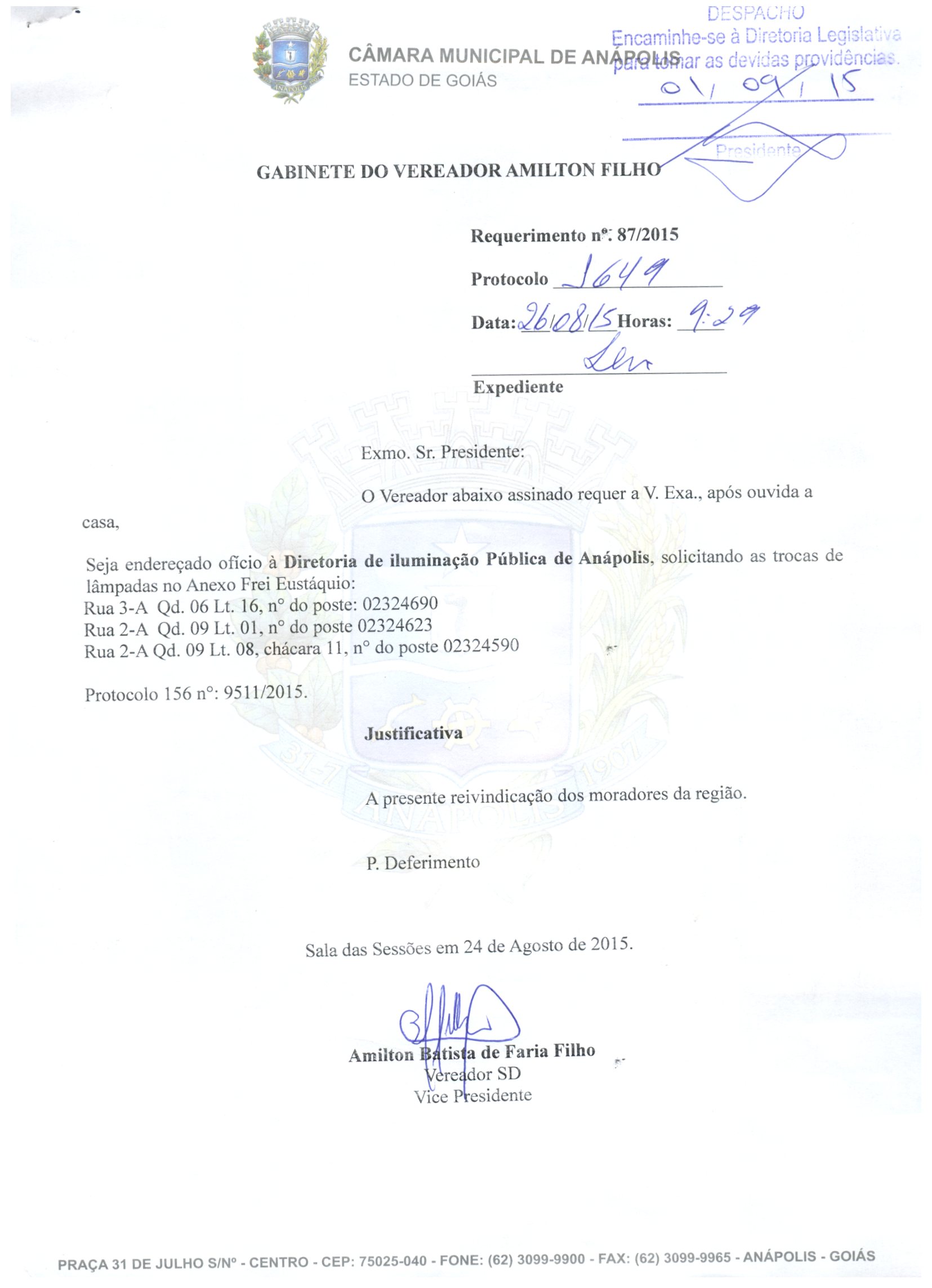 Ementa: À DIRETORIA DE ILUMINAÇÃO PÚBLICA DE ANÁPOLIS, SOLICITANDO AS TROCAS DE LÂMPADAS NO ANEXO FREI EUSTÁQUIO: RUA 3-A, QUADRA 06, LOTE 16, Nº DO POSTE: 02324690 RUA 2-A, QUADRA 09, LOTE 01, Nº DO POSTE: 02324623 RUA 2-A, QUADRA 09, LOTE 08, CHÁCARA 11, Nº DO POSTE: 02324590
