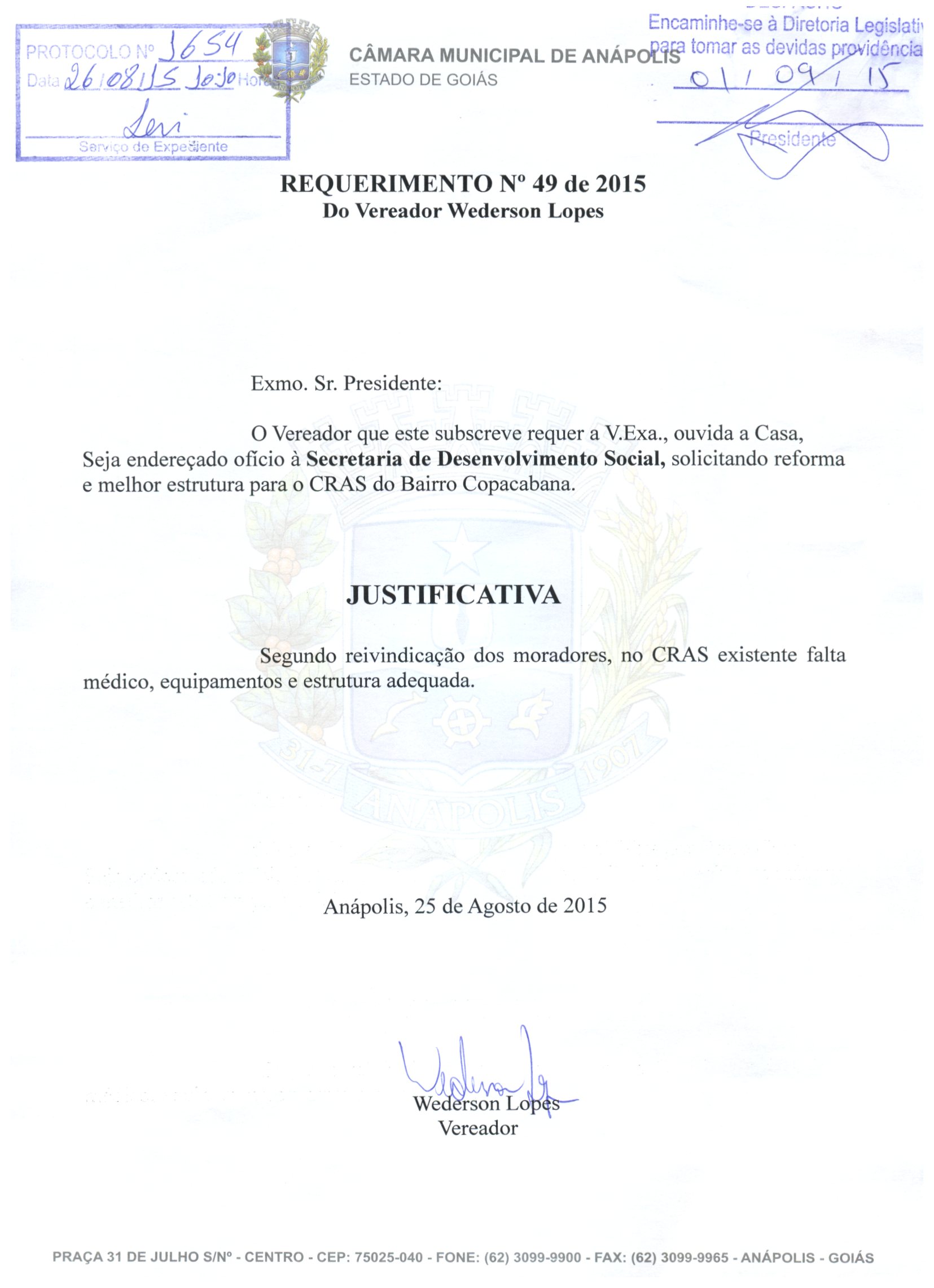 Ementa: À SECRETARIA DE DESENVOLVIMENTO SOCIAL, SOLICITANDO REFORMA E MELHOR ESTRUTURA PARA O CRAS DO BAIRRO COPACABANA.
