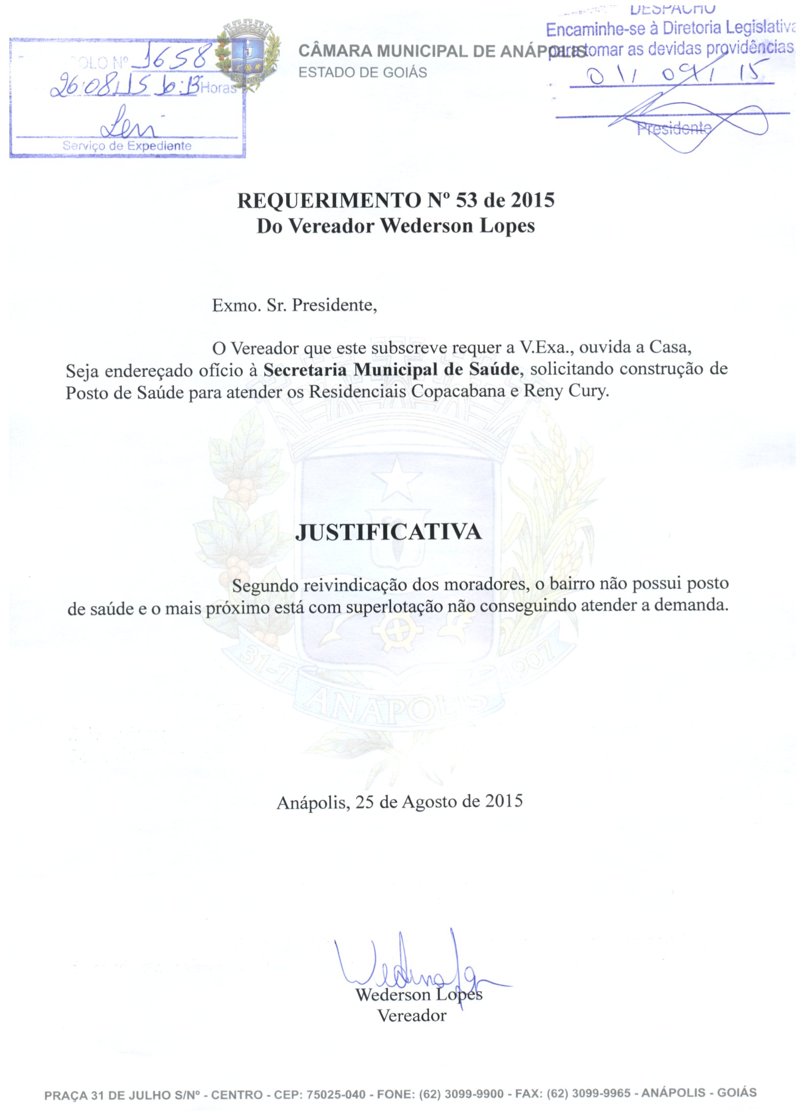 Ementa: À SECRETARIA MUNICIPAL DE SAÚDE, SOLICITANDO CONSTRUÇÃO DE POSTO DE SAÚDE PARA ATENDER OS RESIDENCIAIS COPACABANA E RENY CURY.