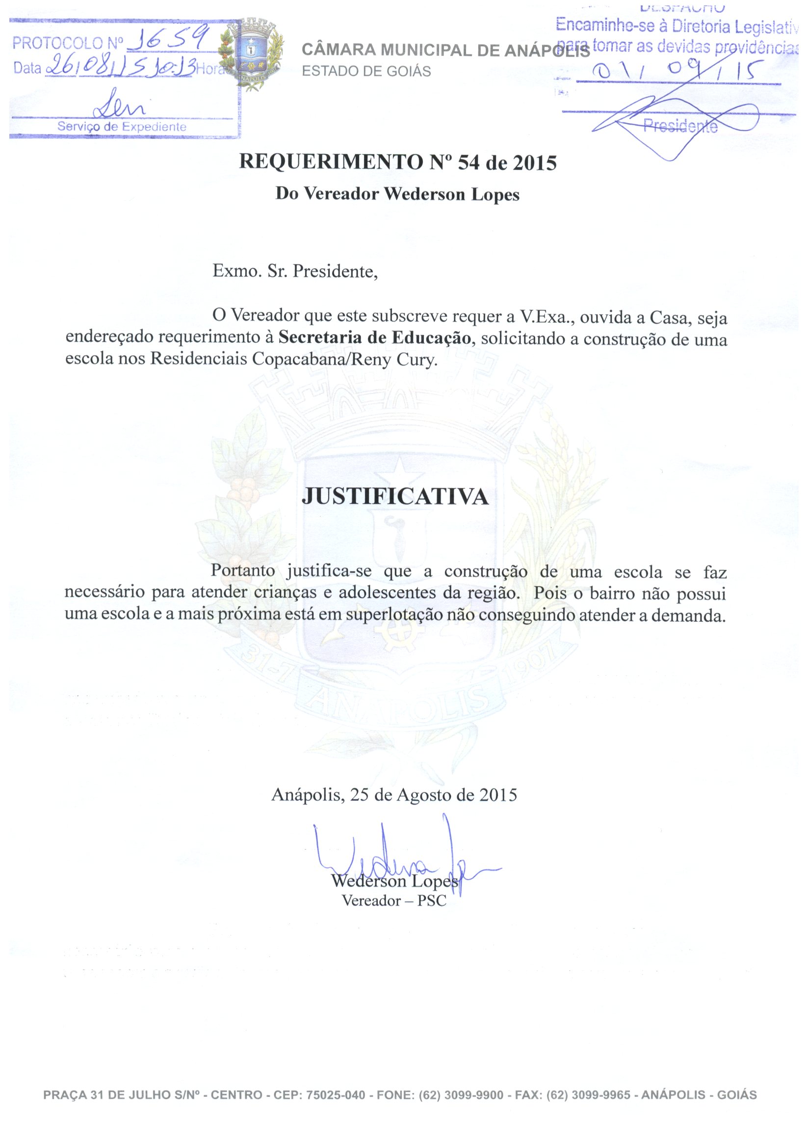 Ementa: À SECRETARIA MUNICIPAL DE EDUCAÇÃO, SOLICITANDO A CONSTRUÇÃO DE UMA ESCOLA NOS RESIDENCIAIS COPACABANA E RENY CURY.