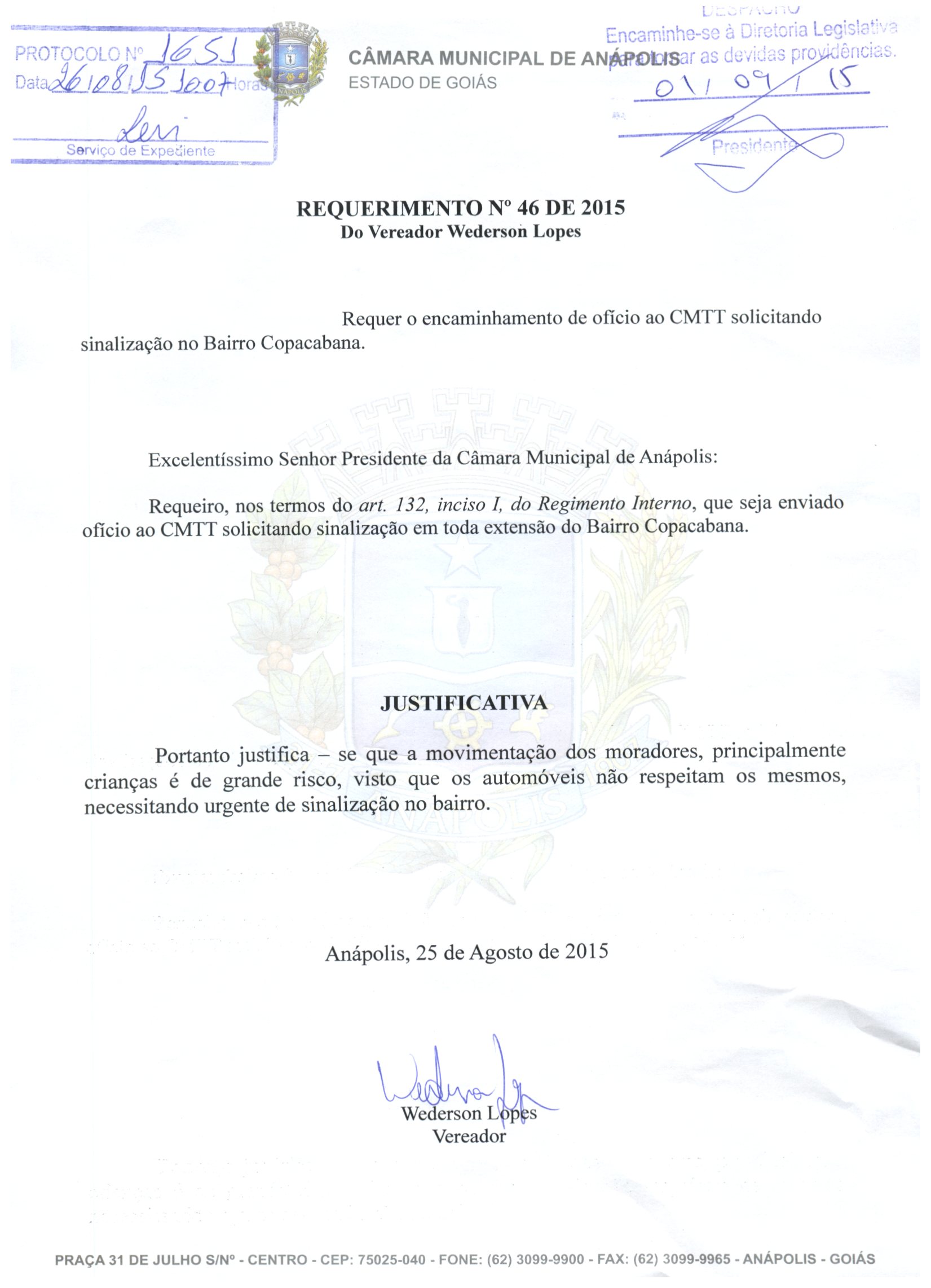 Ementa: QUE SEJA ENVIADO OFÍCIO AO CMTT, SOLICITANDO SINALIZAÇÃO EM TODA EXTENSÃO DO BAIRRO COPACABANA.