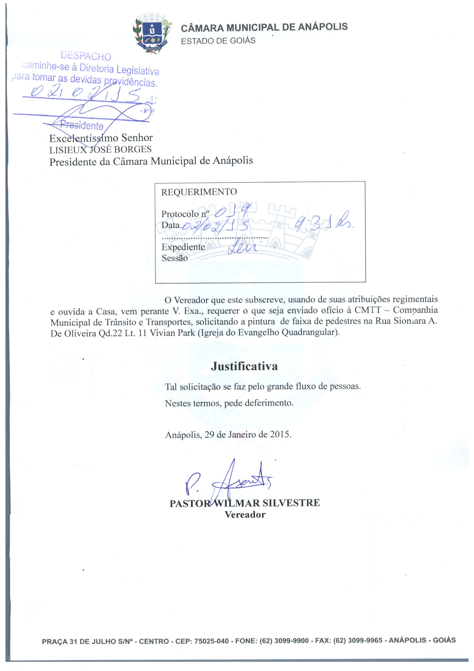 Ementa: O VEREADOR QUE ESTE SUBSCREVE, USANDO DE SUAS ATRIBUIÇÕES REGIMENTAIS E OUVIDA A CASA, VEM PERANTE V. EXA., REQUERER O QUE SEJA ENVIADO OFÍCIO À CMTT — COMPANHIA MUNICIPAL DE TRÂNSITO E TRANSPORTES, SOLICITANDO A PINTURA DE FAIXA DE PEDESTRES NA RUA SIONIARA A. DE OLIVEIRA, QD.22, LT. 11, VIVIAN PARK (IGREJA DO EVANGELHO QUADRANGULAR).