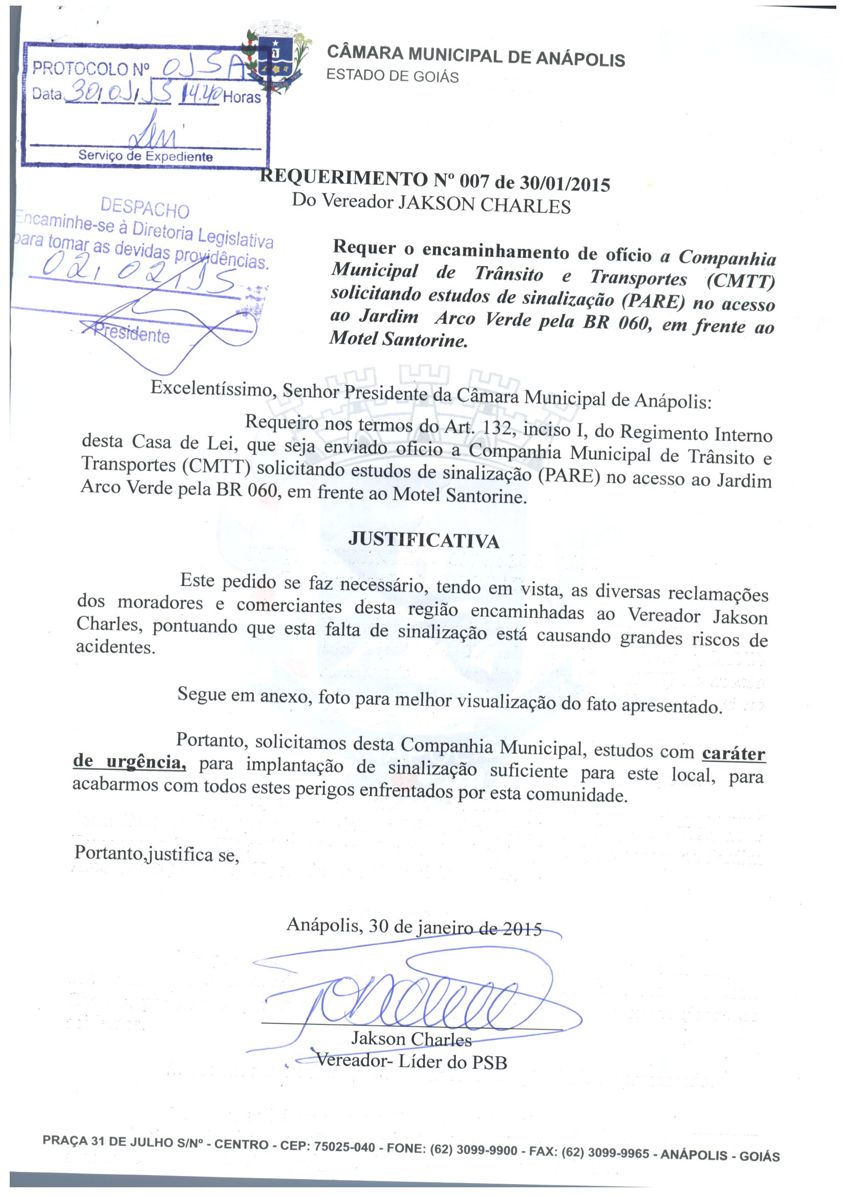 Ementa: REQUEIRO NOS TERMOS DO ART. 132, INCISO I, DO REGIMENTO INTERNO DESTA CASA DE LEI, QUE SEJA ENVIADO OFICIO À COMPANHIA MUNICIPAL DE TRÂNSITO E TRANSPORTES (CMTT) SOLICITANDO ESTUDOS DE SINALIZAÇÃO (PARE) NO ACESSO AO JARDIM ARCO VERDE PELA BR 060, EM FRENTE AO MOTEL SANTORINE.