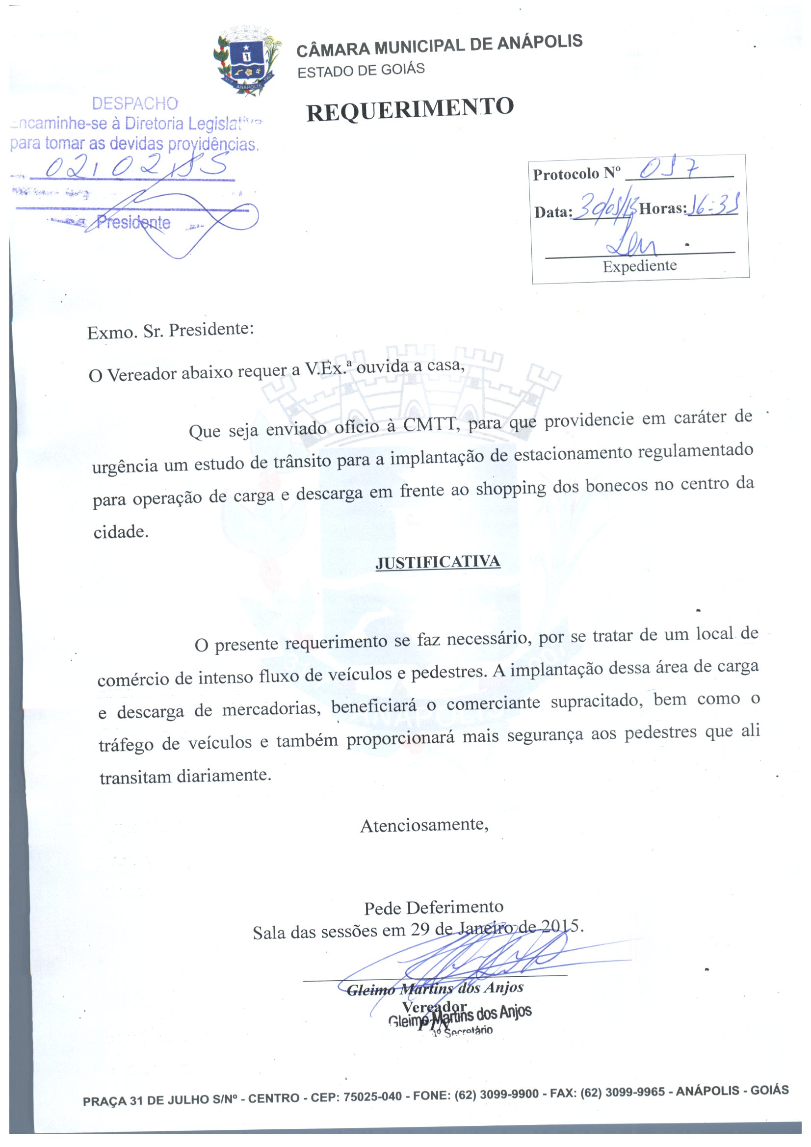 Ementa: QUE SEJA ENVIADO OFICIO À CMTT, PARA QUE PROVIDENCIE EM CARÁTER DE URGÊNCIA UM ESTUDO DE TRÂNSITO PARA A IMPLANTAÇÃO DE ESTACIONAMENTO REGULAMENTADO PARA OPERAÇÃO DE CARGA E DESCARGA EM FRENTE AO SHOPPING DOS BONECOS NO CENTRO DA CIDADE.