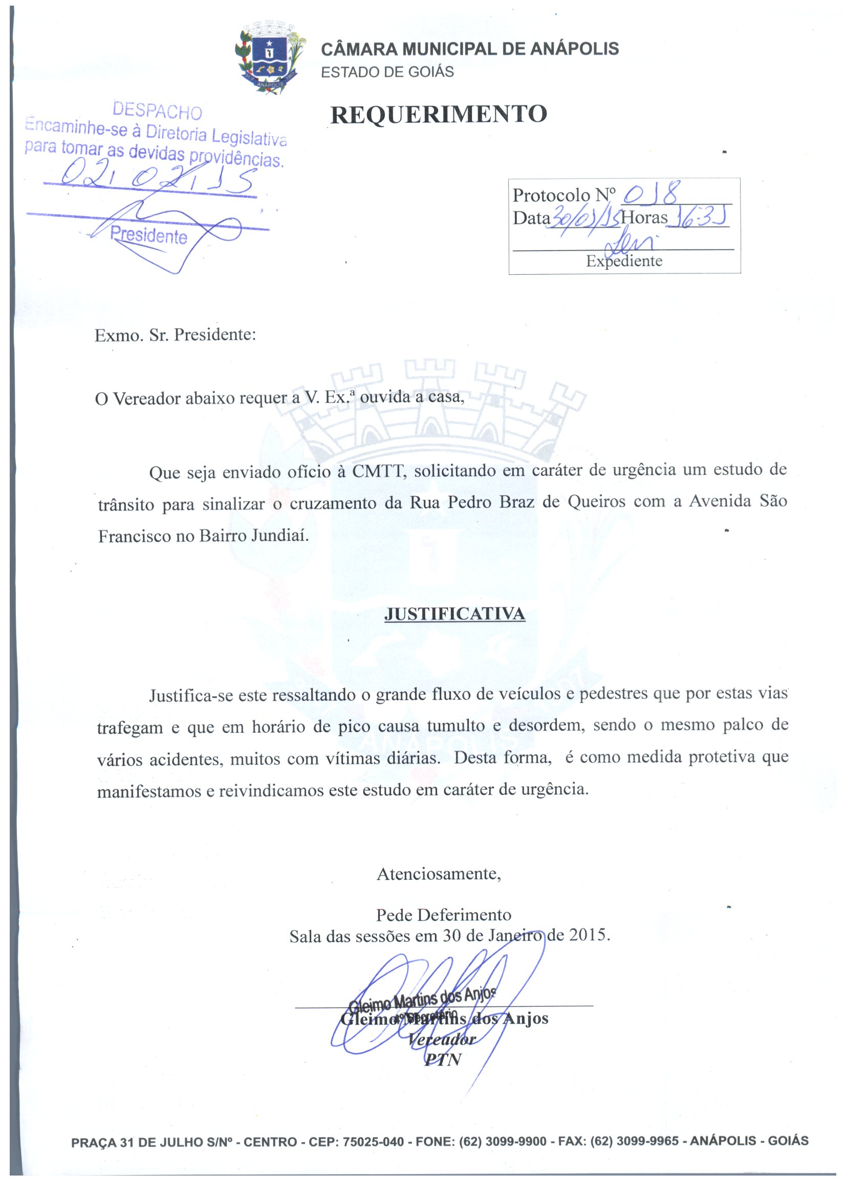 Ementa: QUE SEJA ENVIADO OFICIO À CMTT, SOLICITANDO EM CARÁTER DE URGÊNCIA UM ESTUDO DE TRÂNSITO PARA SINALIZAR O CRUZAMENTO DA RUA PEDRO BRAZ DE QUEIROS COM A AVENIDA SÃO FRANCISCO NO BAIRRO JUNDIAÍ.