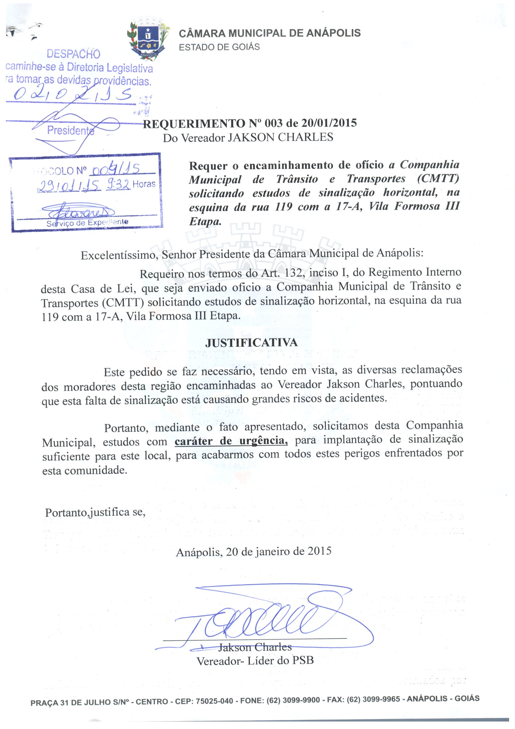 Ementa: REQUEIRO NOS TERMOS DO ART. 132, INCISO I, DO REGIMENTO INTERNO DESTA CASA DE LEI, QUE SEJA ENVIADO OFICIO A COMPANHIA MUNICIPAL DE TRÂNSITO E TRANSPORTES (CMTT) SOLICITANDO ESTUDOS DE SINALIZAÇÃO HORIZONTAL, NA ESQUINA DA RUA 119 COM A 17-A, VILA FORMOSA III ETAPA.