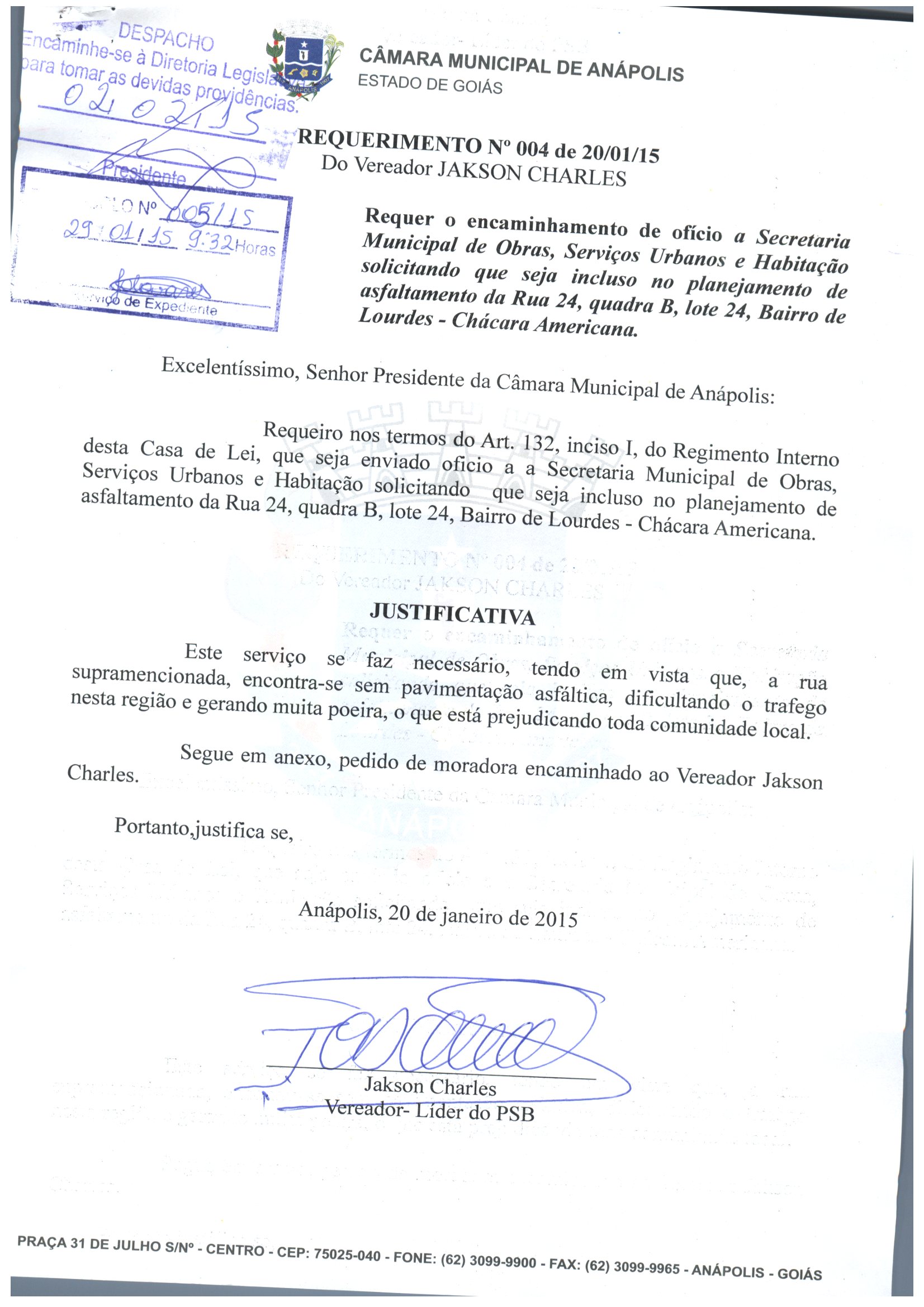 Ementa: REQUEIRO NOS TERMOS DO ART. 132, INCISO I, DO REGIMENTO INTERNO DESTA CASA DE LEI, QUE SEJA ENVIADO OFICIO À SECRETARIA MUNICIPAL DE OBRAS, SERVIÇOS URBANOS E HABITAÇÃO SOLICITANDO QUE SEJA INCLUSO NO PLANEJAMENTO DE ASFALTAMENTO DA RUA 24, QUADRA B, LOTE 24, BAIRRO DE LOURDES - CHÁCARA AMERICANA.