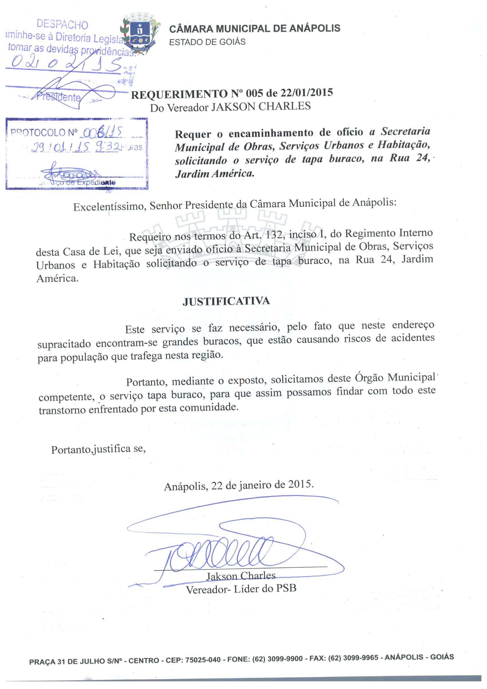 Ementa: REQUEIRO NOS TERMOS DO ART. 132, INCISO I, DO REGIMENTO INTERNO DESTA CASA DE LEI, QUE SEJA ENVIADO OFICIO À SECRETARIA MUNICIPAL DE OBRAS, SERVIÇOS URBANOS E HABITAÇÃO SOLICITANDO O SERVIÇO DE TAPA BURACO, NA RUA 24, JARDIM AMÉRICA.