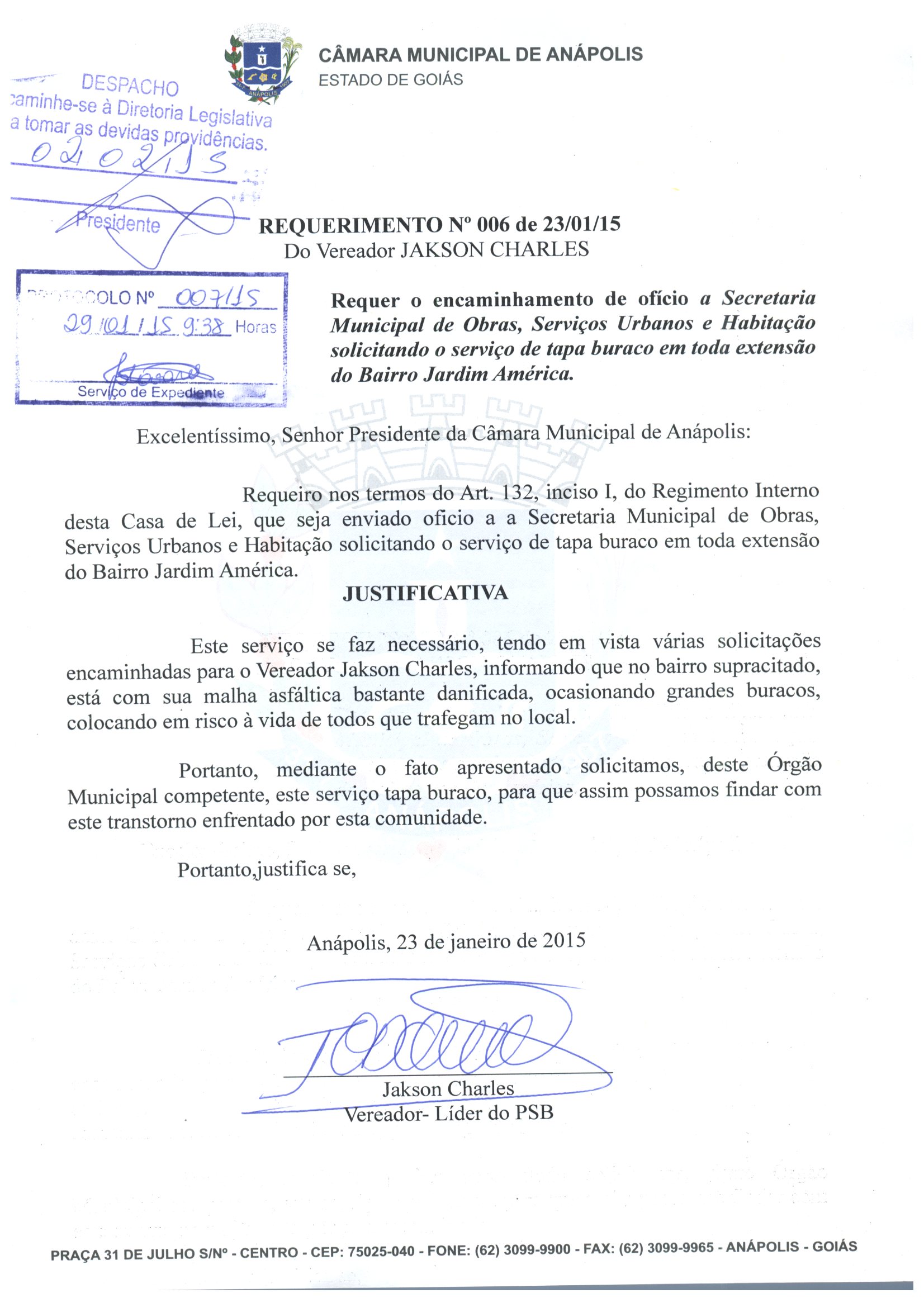Ementa: REQUEIRO NOS TERMOS DO ART. 132, INCISO 1, DO REGIMENTO INTERNO DESTA CASA DE LEI, QUE SEJA ENVIADO OFICIO À SECRETARIA MUNICIPAL DE OBRAS, SERVIÇOS URBANOS E HABITAÇÃO SOLICITANDO O SERVIÇO DE TAPA BURACO EM TODA EXTENSÃO DO BAIRRO JARDIM AMÉRICA.