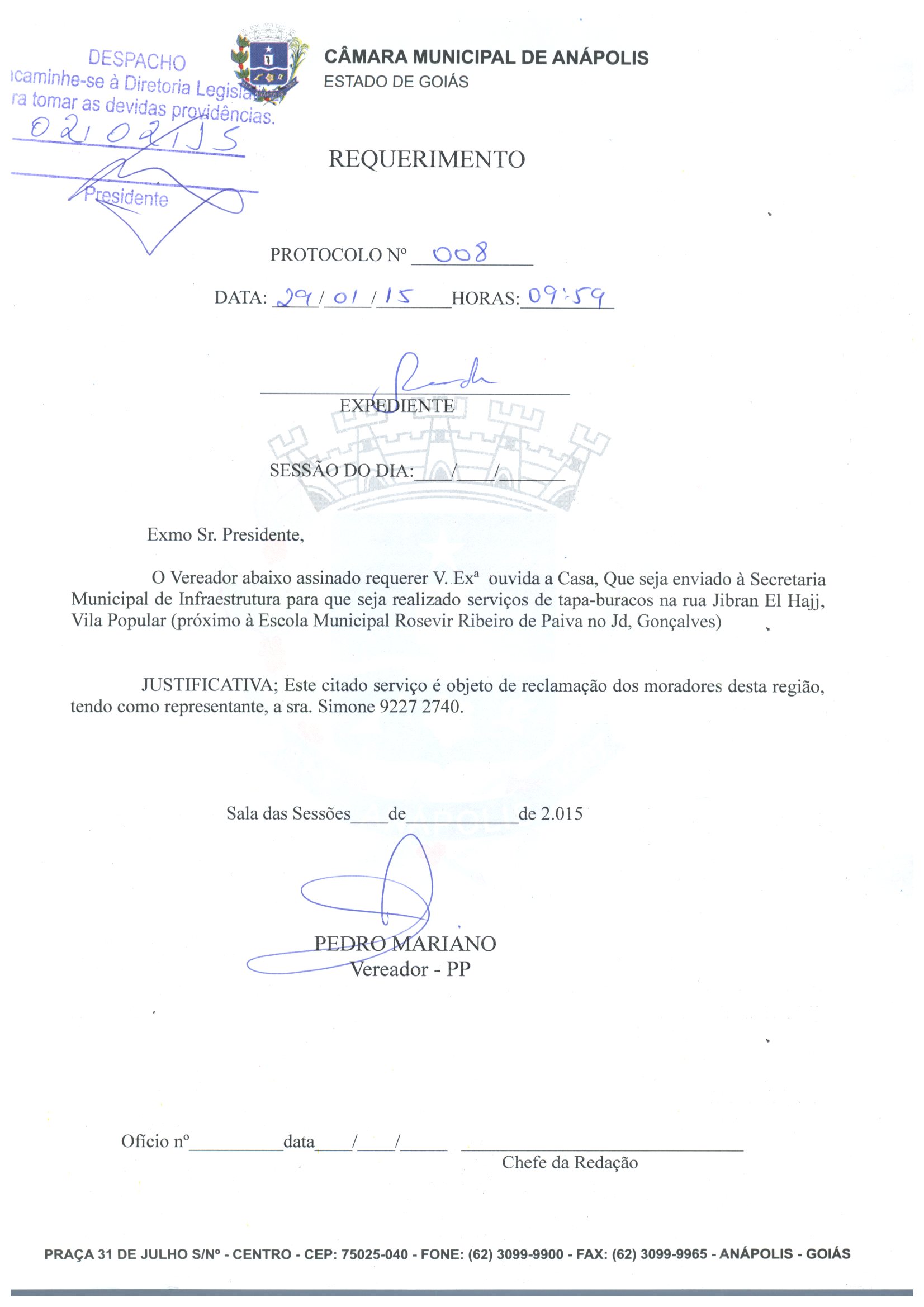 Ementa: QUE SEJA ENVIADO À SECRETARIA MUNICIPAL DE INFRAESTRUTURA PARA QUE SEJA REALIZADO SERVIÇOS DE TAPA-BURACOS NA RUA JIBRAN EL HAJJ, VILA POPULAR (PRÓXIMO À ESCOLA MUNICIPAL ROSEVIR RIBEIRO DE PAIVA NO JD. GONÇALVES)
