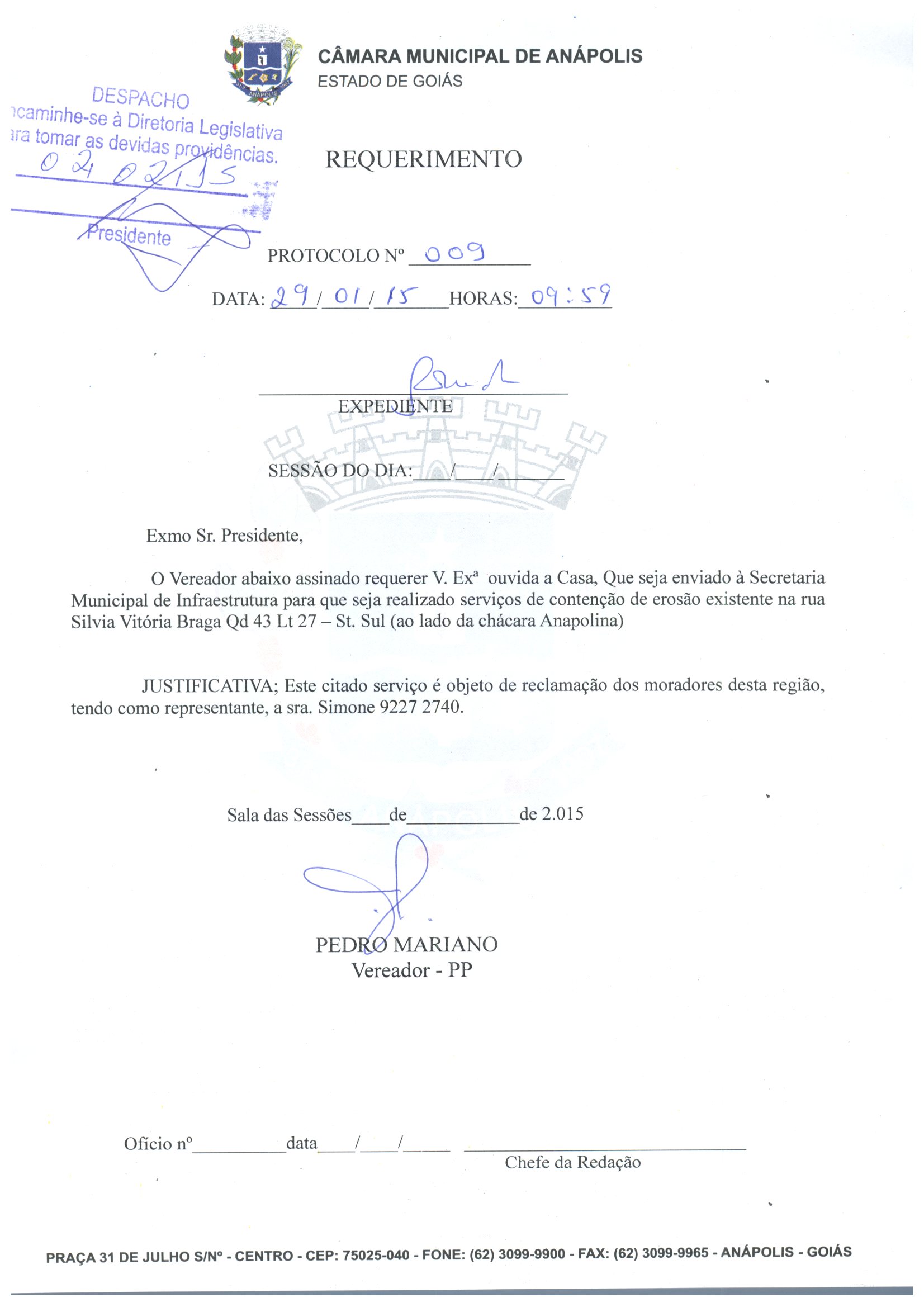 Ementa: QUE SEJA ENVIADO À SECRETARIA MUNICIPAL DE INFRAESTRUTURA PARA QUE SEJA REALIZADO SERVIÇOS DE CONTENÇÃO DE EROSÃO EXISTENTE NA RUA SILVIA VITÓRIA BRAGA, QD. 43, LT. 27 — ST. SUL (AO LADO DA CHÁCARA ANAPOLINA).