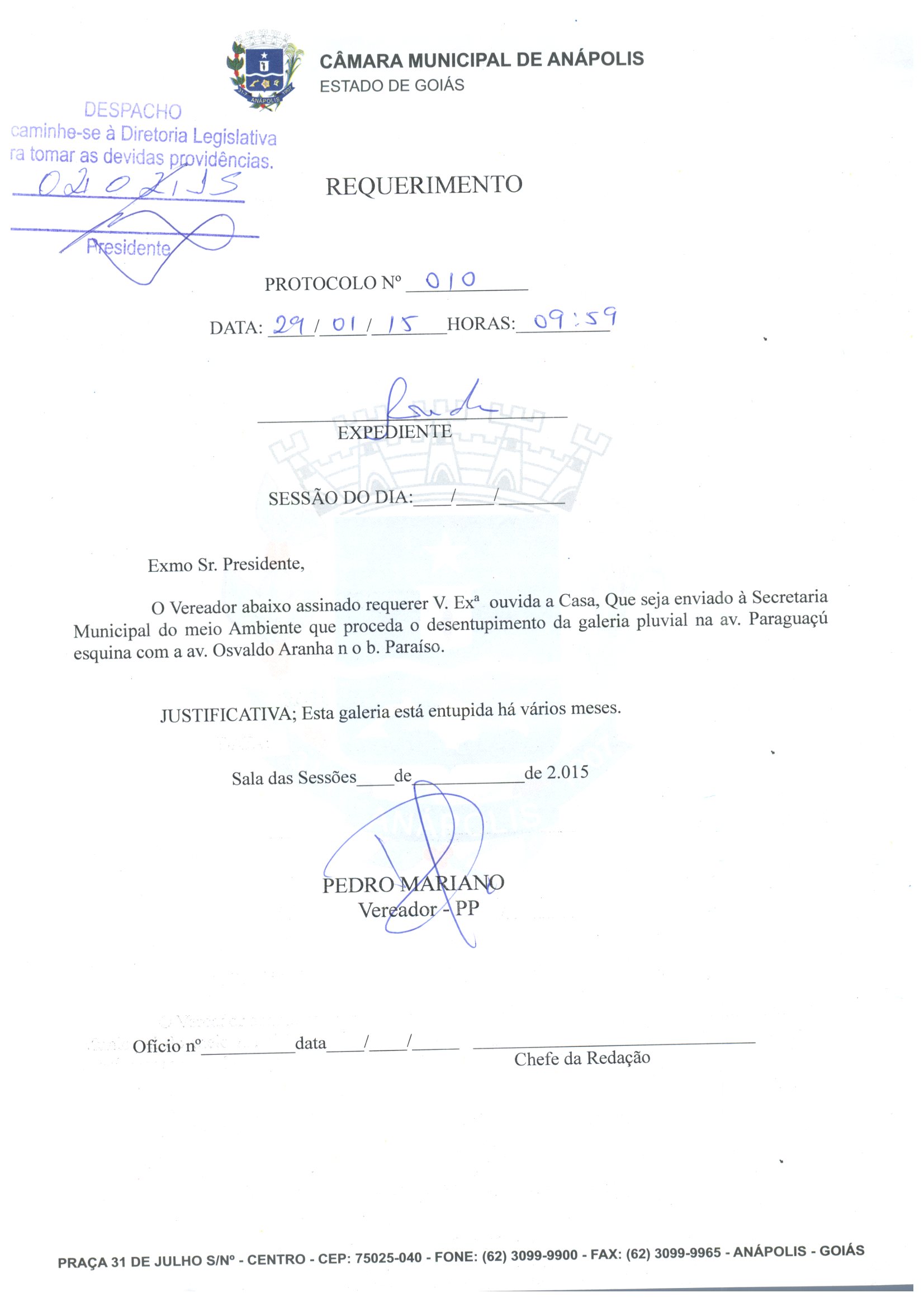 Ementa: O VEREADOR ABAIXO ASSINADO REQUER DE V. EXA OUVIDA A CASA, QUE SEJA ENVIADO À SECRETARIA MUNICIPAL DO MEIO AMBIENTE QUE PROCEDA O DESENTUPIMENTO DA GALERIA PLUVIAL NA AV. PARAGUAÇÚ ESQUINA COM A AV. OSVALDO ARANHA NO B. PARAÍSO.