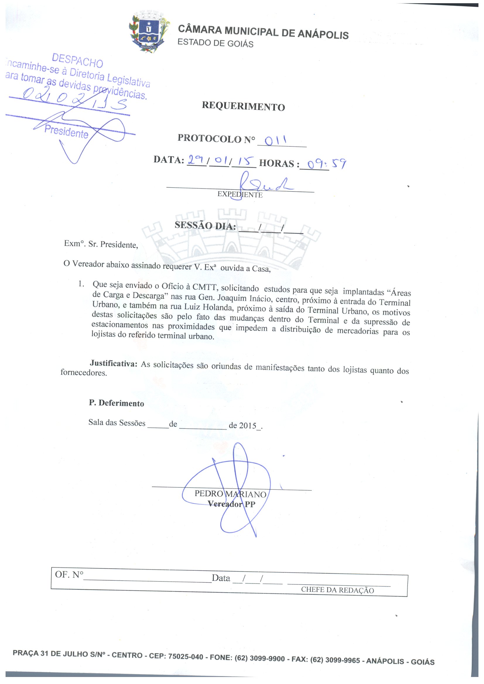 Ementa: QUE SEJA ENVIADO O OFÍCIO À CMTT, SOLICITANDO ESTUDOS PARA QUE SEJA IMPLANTADAS "ÁREAS DE CARGA E DESCARGA" NAS RUA GEN. JOAQUIM INÁCIO, CENTRO, PRÓXIMO À ENTRADA DO TERMINAL URBANO, E TAMBÉM NA RUA LUIZ HOLANDA, PRÓXIMO À SAÍDA DO TERMINAL URBANO, OS MOTIVOS DESTAS SOLICITAÇÕES SÃO PELO FATO DAS MUDANÇAS DENTRO DO TERMINAL E DA SUPRESSÃO DE ESTACIONAMENTOS NAS PROXIMIDADES QUE IMPEDEM A DISTRIBUIÇÃO DE MERCADORIAS PARA OS LOJISTAS DO REFERIDO TERMINAL URBANO.