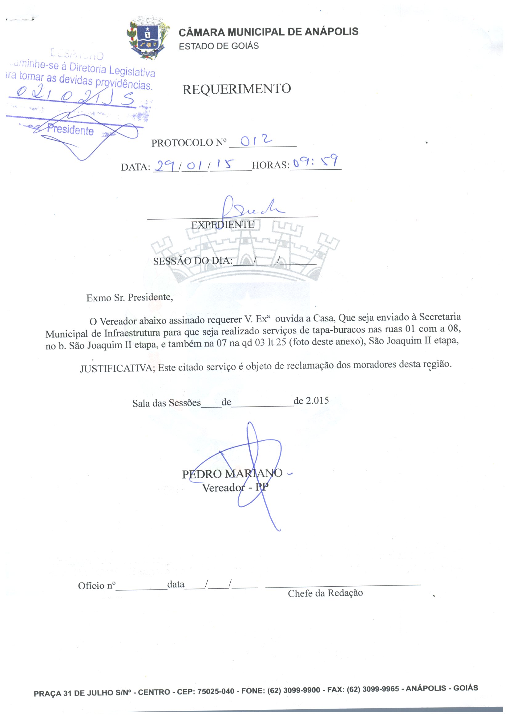 Ementa: QUE SEJA ENVIADO À SECRETARIA MUNICIPAL DE INFRAESTRUTURA PARA QUE SEJA REALIZADO SERVIÇOS DE TAPA-BURACOS NAS RUAS 01 COM A 08, NO B. SÃO JOAQUIM II ETAPA, E TAMBÉM NA 07, NA QD 03, LT 25 (FOTO DESTE ANEXO), SÃO JOAQUIM II ETAPA,