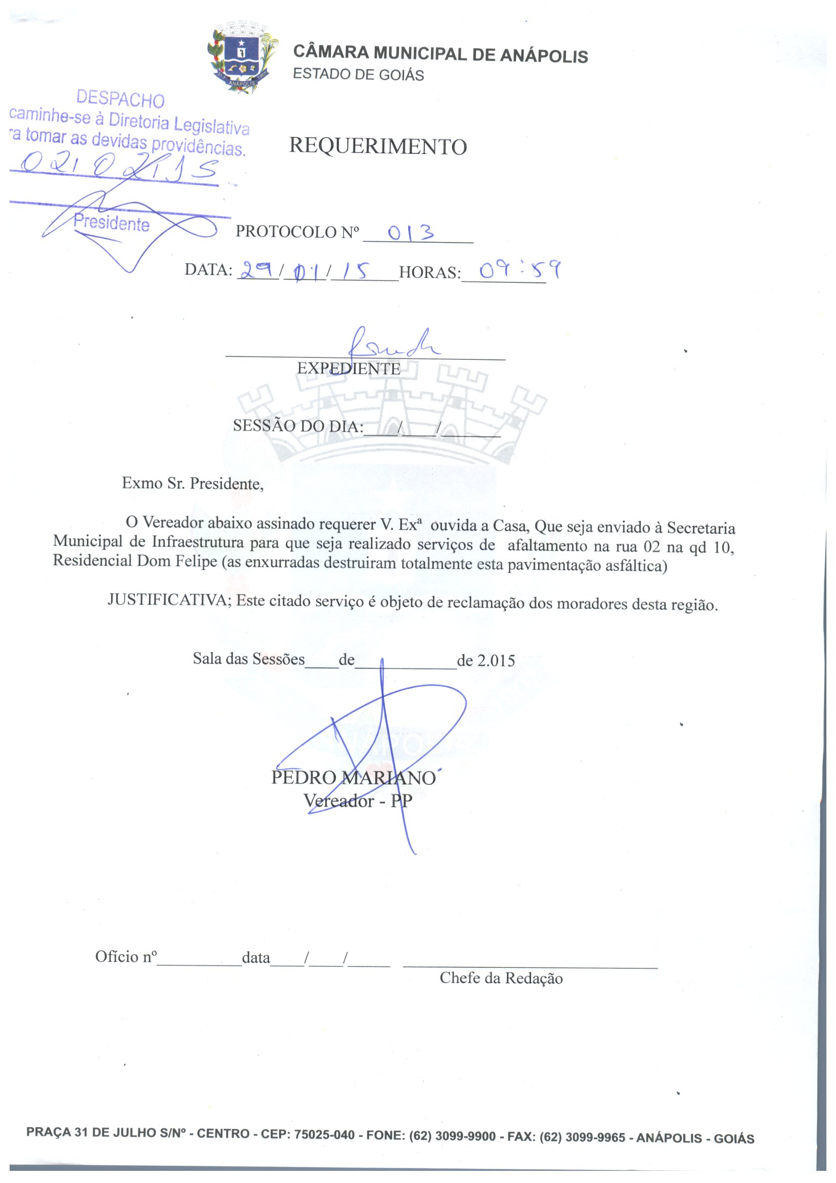 Ementa: QUE SEJA ENVIADO À SECRETARIA MUNICIPAL DE INFRAESTRUTURA PARA QUE SEJA REALIZADO SERVIÇOS DE ASFALTAMENTO NA RUA 02, NA QD 10, RESIDENCIAL DOM FELIPE (AS ENXURRADAS DESTRUÍRAM TOTALMENTE ESTA PAVIMENTAÇÃO ASFÁLTICA)