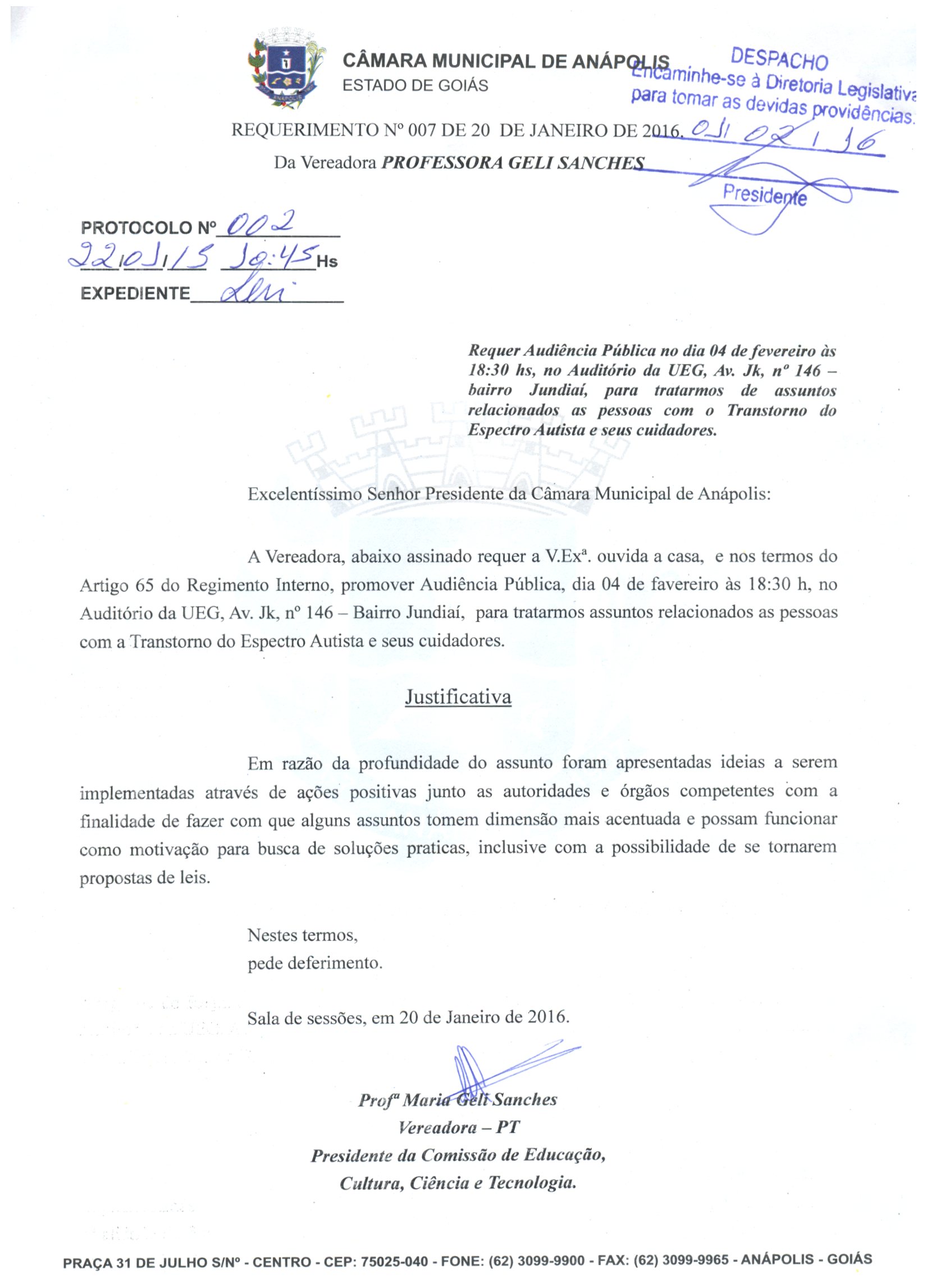 Ementa: AUDIÊNCIA PÚBLICA NO DIA 04 DE FEVEREIRO ÀS 18:30 H, NO AUDITÓRIO DA UEG, AV. JK, N° 146, PARA TRATAR PESSOAS COM TRANSTORNOS RELACIONADOS COM ESPECTRO AUTISTA E SEUS CUIDADOS.