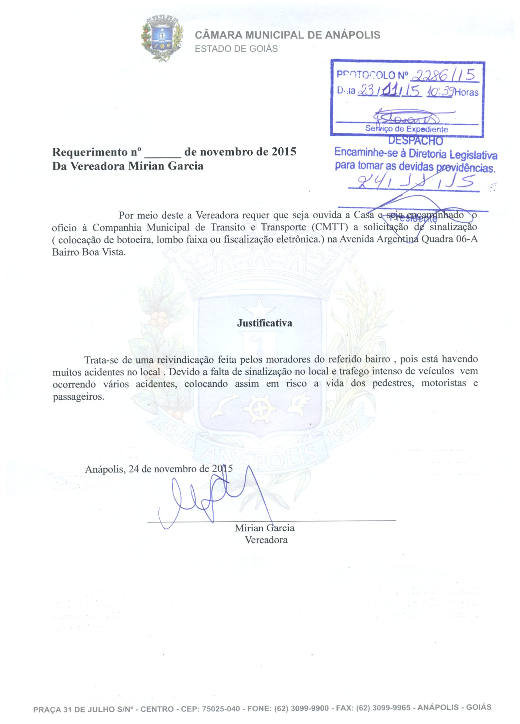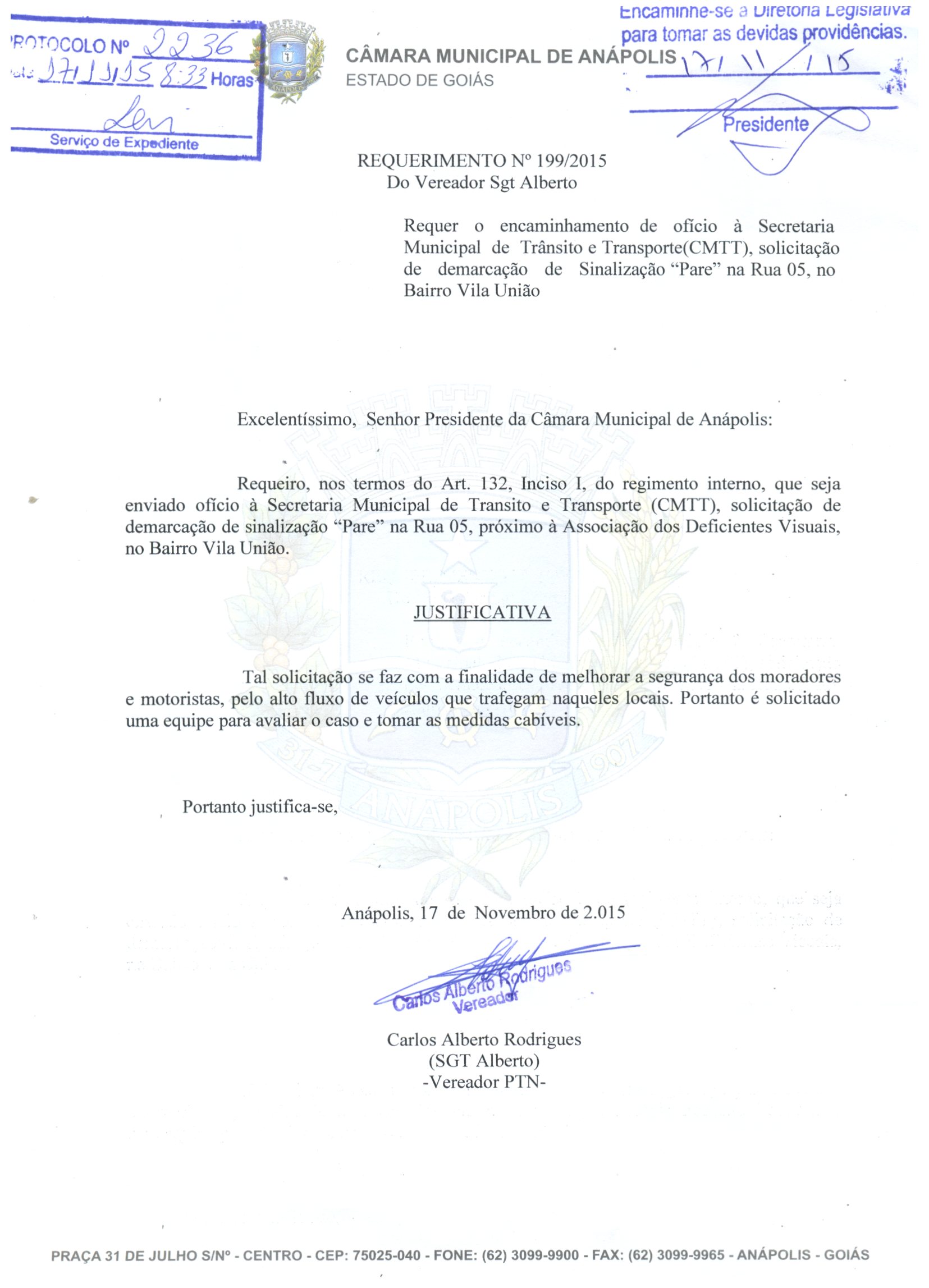 Ementa: À CMTT, SOLICITANDO A IMPLANTAÇÃO DE PLACA OU SINALIZAÇÃO PARE EM TODOS OS CRUZAMENTOS DO SETOR RESIDENCIAL PEDRO LUDOVICO COM A RUA JOSÉ MARTINS DE BRITO E ENTRE A RUA JM 065 E AV. PRESIDENTE JOSÉ SARNEY.