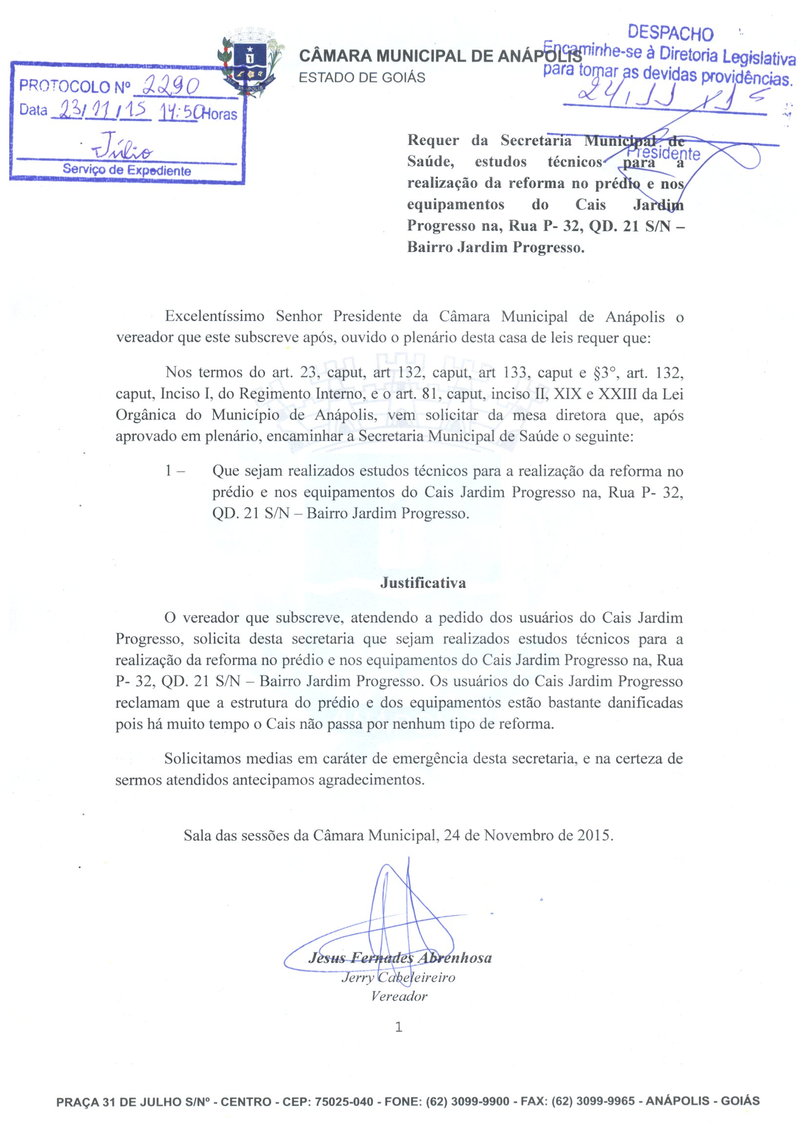 Ementa: À SECRETARIA MUNICIPAL DE SAÚDE SOLICITANDO ESTUDOS TÉCNICOS PARA A REALIZAÇÃO DA REFORMA NO PRÉDIO E NOS EQUIPAMENTOS DO CAIS JARDIM PROGRESSO, NA RUA P-32, QD. 21 S/N, BAIRRO JARDIM PROGRESSO.