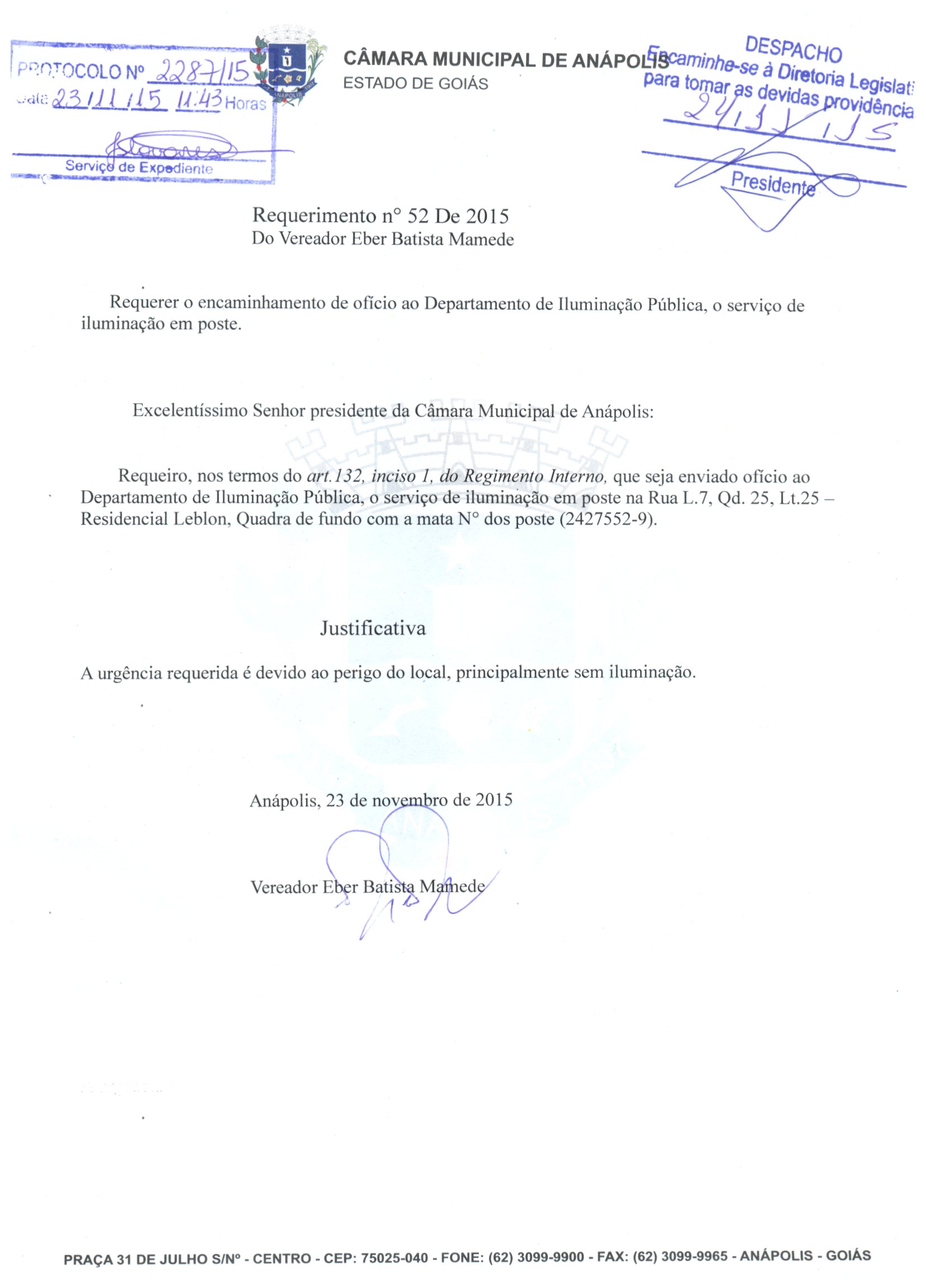 Ementa: AO DEPARTAMENTO DE ILUMINAÇÃO PÚBLICA, SOLICITANDO O SERVIÇO DE ILUMINAÇÃO EM POSTE NA RUA L7 QD. 25 LT. 25, NO RESIDENCIAL LEBLON.