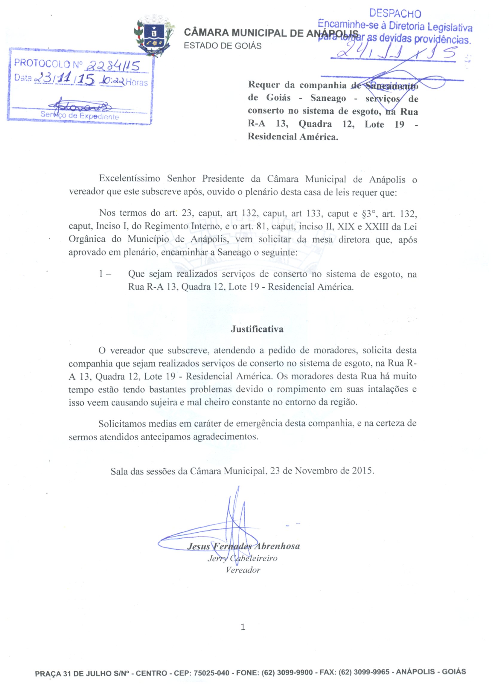 Ementa: À SANEAGO SOLICITANDO O SERVIÇO DE CONSERTO NO SISTEMA DE ESGOTO NA RUA R-A 13, QD. 12, LT. 19, NO RESIDENCIAL AMÉRICA.